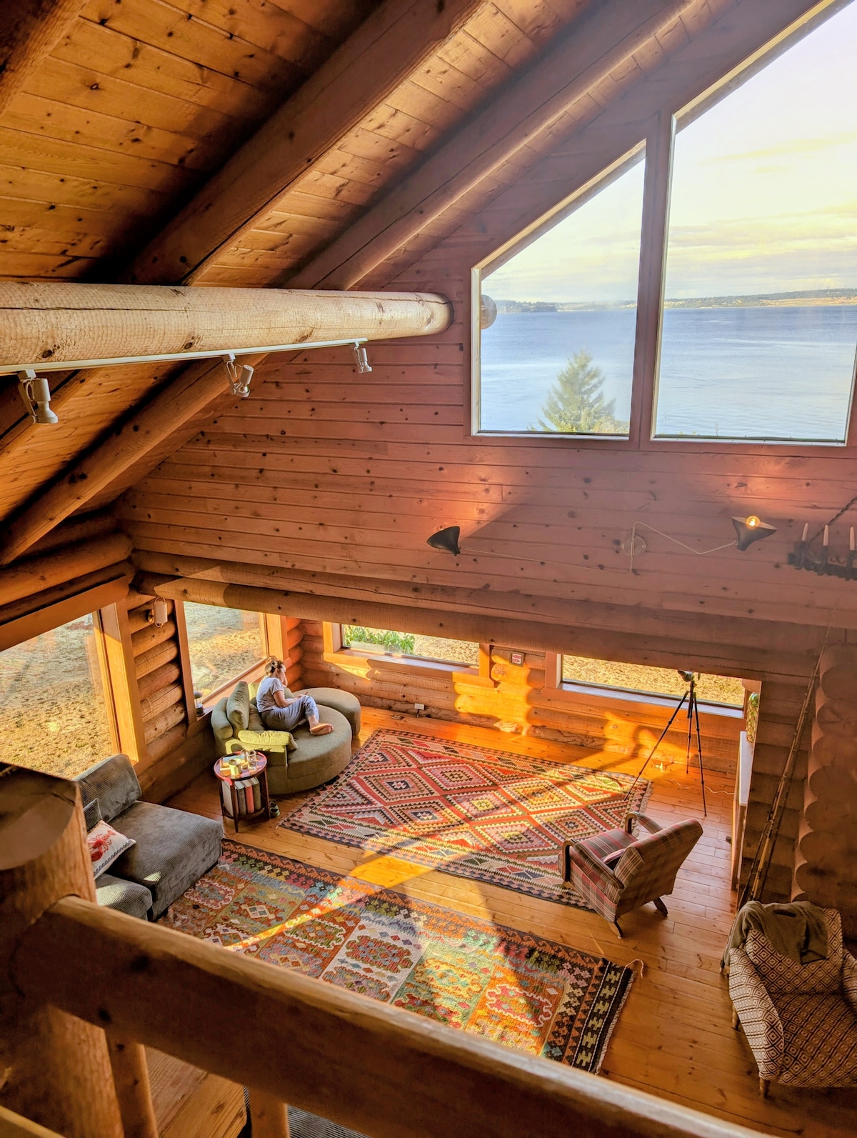 Our place is just a few miles from the Fauntleroy/Vashon ferry terminal, and minutes from the town of Vashon. Tucked snuggly on the West side of the island, the cabin looks west over Colvos Passage. The cabin itself is essentially a spacious studio-- one large room with a loft, a small kitchen, and bathroom. A queen size bed is in the loft, and the couch comfortably sleeps one person. The bathroom has a large clawfoot soaking tub, and there is an outdoor shower. It is extremely cozy!