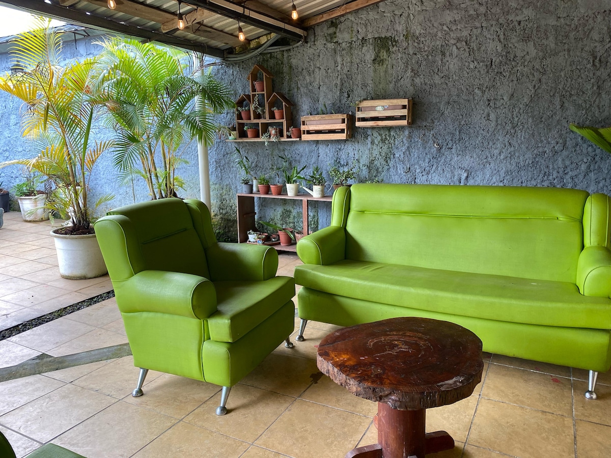 A tan solo 10 minutos del Puyo visita Green house 3. Cabaña de concepto abierto (120m2), equipada para 8 personas: 1 habitación (60m2) 1 cama de 2 plazas, 2 literas (2 plazas abajo y 1 plaza y media arriba) Ducha con agua caliente y fría (1 ducha eléctrica) 2 baños completos. Sala y cocina exterior, cocineta, vajilla completa para 8 personas (ollas, utensilios), zona para Bbq. Garaje gratuito, wifi. No aceptamos mascotas Desayuno incluido
