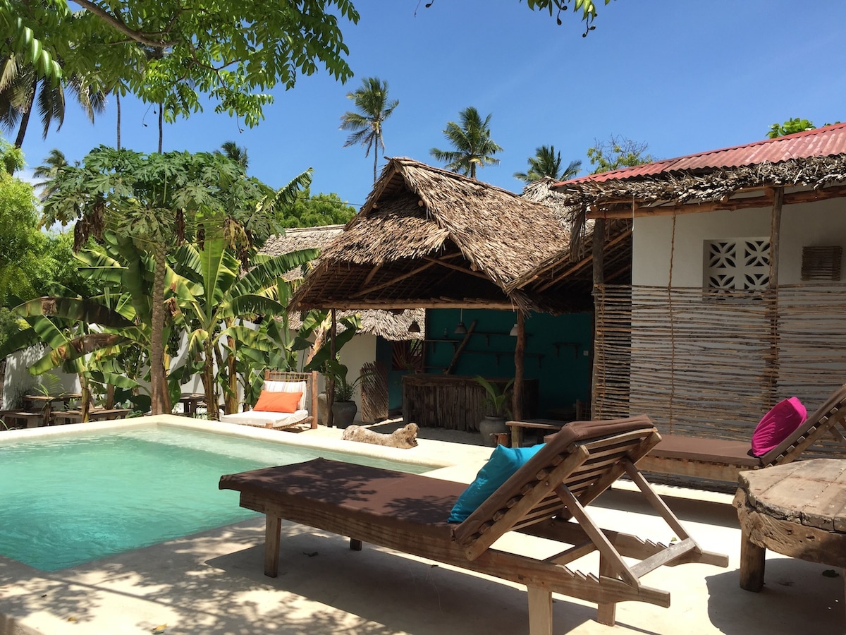 Comfortable and cozy room with independent entrance , ceiling fan and air condition, fully furnished, in a villa with infinity swimming pool (for swimming and relaxing) located at 1 minute walking from the beautiful, white, sandy beach of Paje, one of the best spot of Zanzibar island for its beach/sea, its night life, its sport activities (kitesurf in particular). We will be more than happy to host you! See you soon in Paje!
