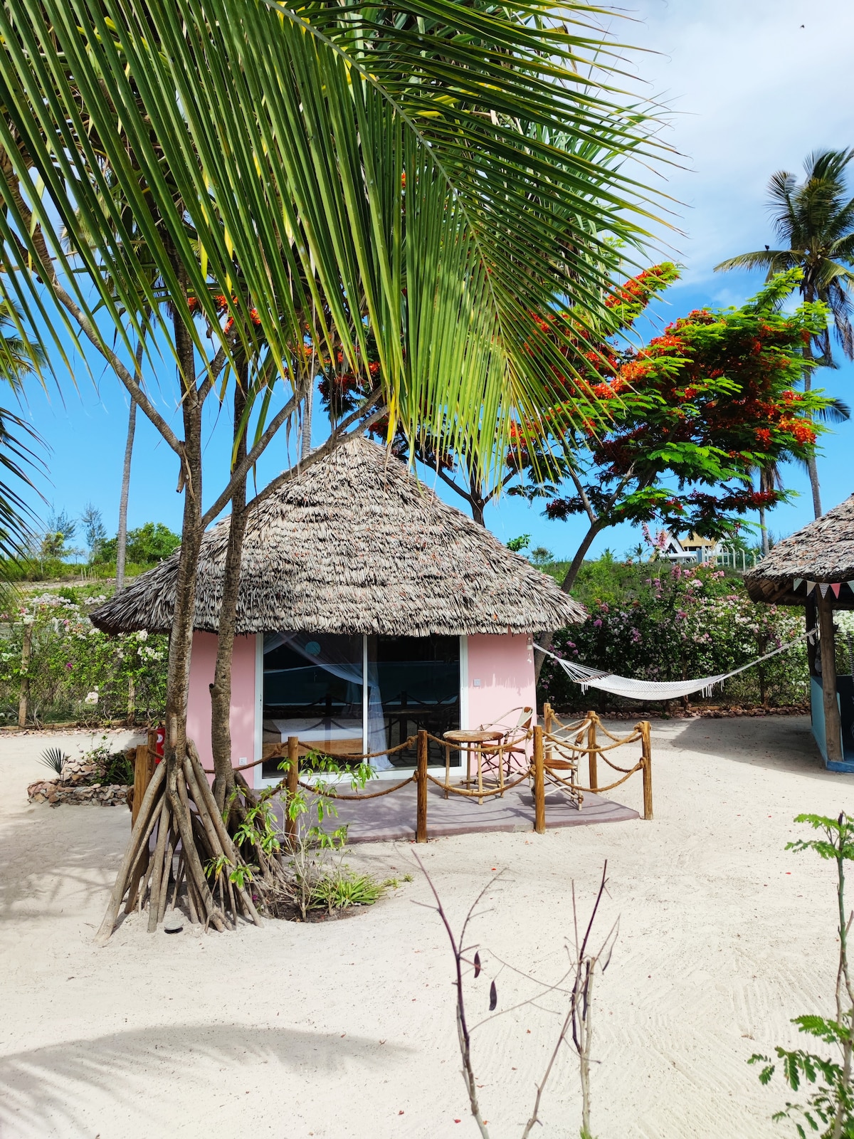 🌴 Highlights at a Glance: - 4-minute walk to the peaceful Bwejuu Beach - Rooftop terrace with 360° sunrise & sunset views - Private bungalow with en-suite bathroom - Fully equipped kitchen for self-catering - Stable WiFi connection - Quiet tropical garden with palm trees & hammock - Free parking directly on the property - Optional airport pickup & Swahili meals available - E-scooter rental for $20/day