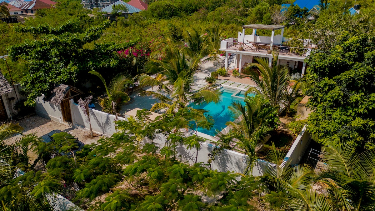 A new fully furnished 2 bedroom villa with full security with a swimming pool and astonishing garden, perfect for honeymooners, family or friends. Located at Jambiani less than a min walk to main road, 3 min walk to the beach. 5 min drive to Paje. Opposite of Shanti Cafe where you can get services like yoga, breakfast, lunch and dinner Full privacy including swimming pool Relax with the whole family at this peaceful place to stay.