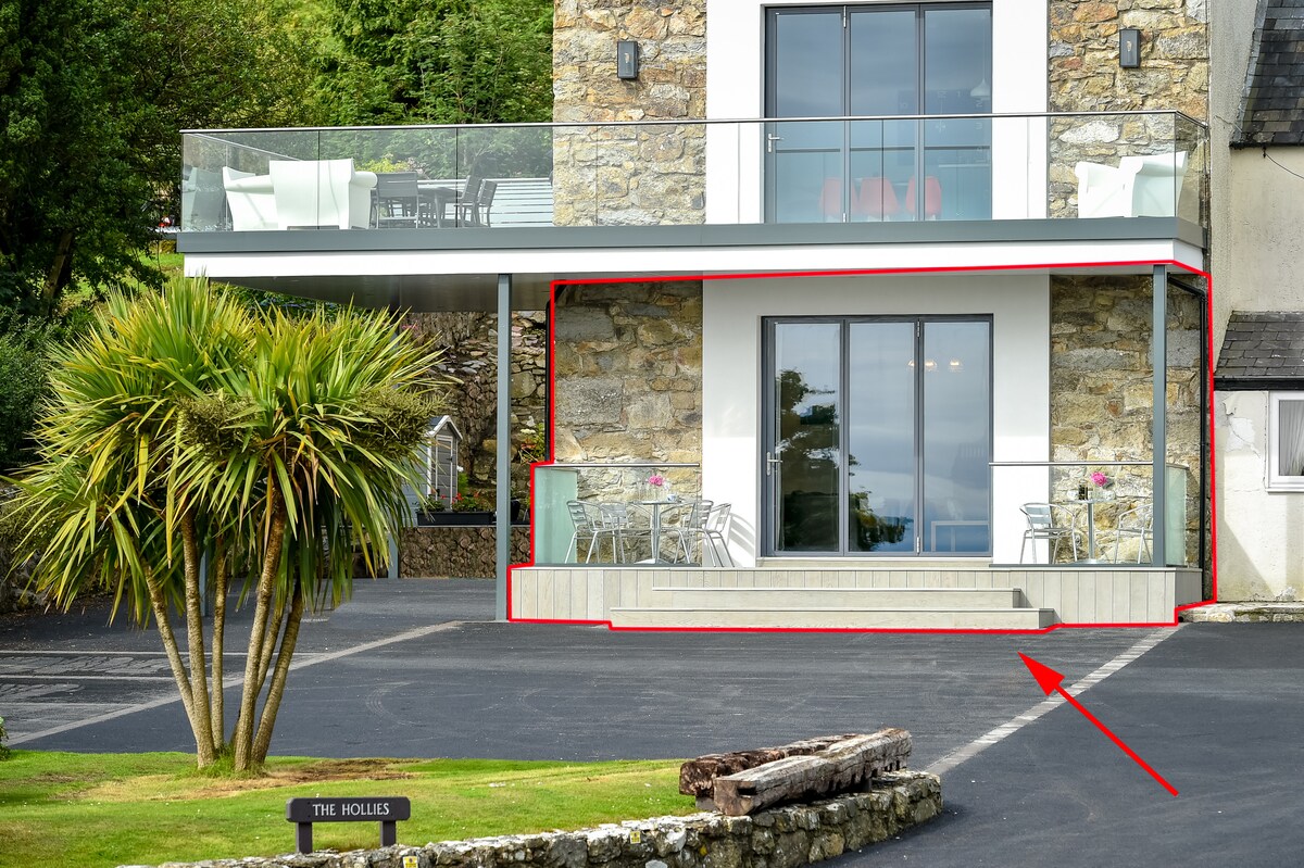 'THE VIEW' is a stunningly located contemporary FIRST FLOOR apartment! We can sleep 4 or even 8 guests if booked together with our no. 2 ‘THE VIEW’ on the ground floor! Lounge back on the sofa, and gaze out on to the whole of Anglesey and all the way down the famous waters of the Menai Straits. Just minutes from the A55 it’s the perfect hub to explore the wonders of both Anglesey and Snowdonia 'THE VIEW' is your perfect dream get away from the hustle and bustle of modern life and relax!