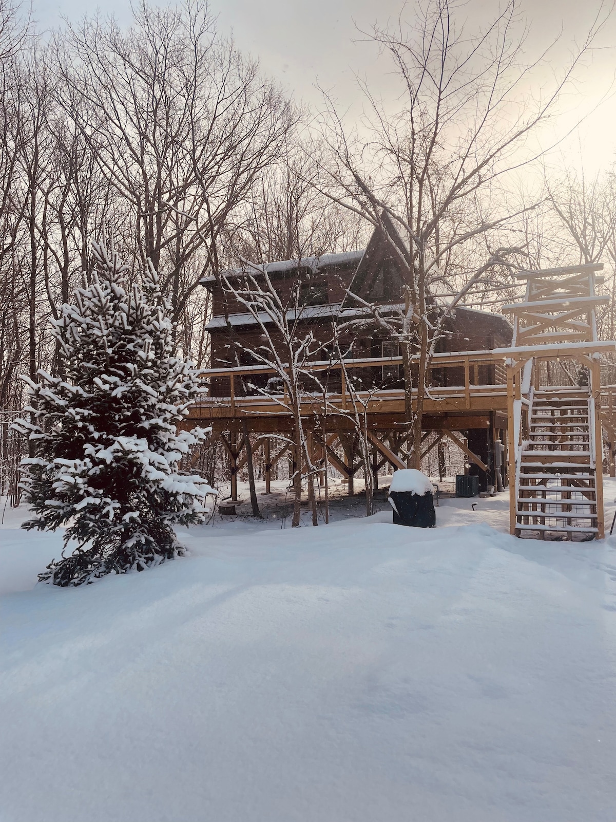 This is tiny cabin in the woods! Have you ever used a hot tub in the snow? You should try it! Sometimes we just want to be alone. Sweet Solitude is a private place to focus on what's really most important, especially for couples. Our cabin locally sourced. The timbers were sawed at a local hemlock mill. The exterior is made of boards we had milled from old pines along US Hwy 322. Even the stones we laid for the fireplace once splashed in a local creek.