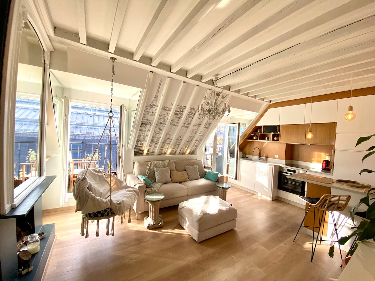 Charming, fully renovated and architect designed split level one-bedroom in the historical heart of Paris. Located in the central and trendy 2nd arrondissement. So peaceful ... enjoy your sleep. Short walk away from major spots in Paris Or hop on one of the five Metro lines available at hand. CHECK-IN FROM 2PM (earlier if no other guest is checking out the same day) - LUGGAGE DROP OFF AFTER 10AM Low ceiling on upper floor - not suitable for infants/toddlers (STAIRCASE) - read full description