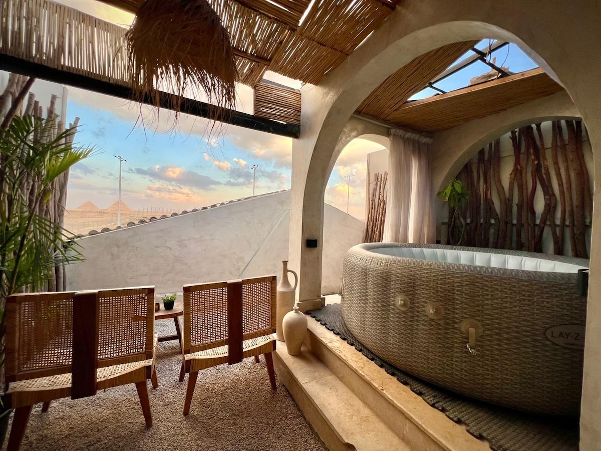 Escape to a one-of-a-kind artistic retreat, where nature and design come together in perfect harmony. This handcrafted studio, just a 5-minute walk from the Pyramids of Giza, offers an immersive experience with natural materials, bespoke handmade furniture, and breathtaking pyramids views right from your private jacuzzi.