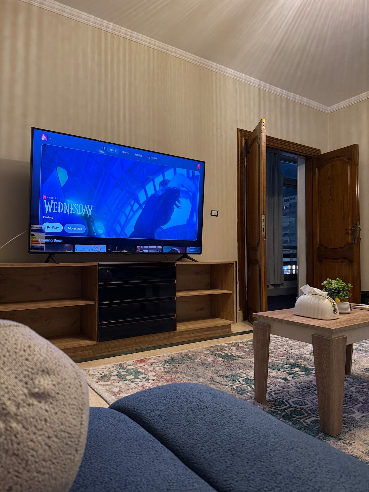� وصف الشقة: 🛋️ غرفة المعيشة تجربة فندقية فاخرة بلمسة منزلية راقية! استمتع بأجواء راقية تجمع بين الفخامة والراحة، حيث تتميز غرفة المعيشة بتصميم عصري أنيق ومساحة واسعة بعناية. تضم منطقة جلوس مريحة مثالية للاسترخاء، وجهاز PS4 للترفيه. ولعشّاق المشاهدة، ستستمتع بـ تلفزيون OLED سينمائي فاخر مقاس 75 بوصة مع جودة صورة مذهلة، إلى جانب إنترنت فائق السرعة لتجربة ترفيه متكاملة تناسب الإقامات القصيرة والطويلة 🍸 المطبخ: مفتوح على غرفة المعيشة بأسلوب أنيق، ومزوّد بـ كراسي بار فاخرة تضيف لمسة جمالية راقية.