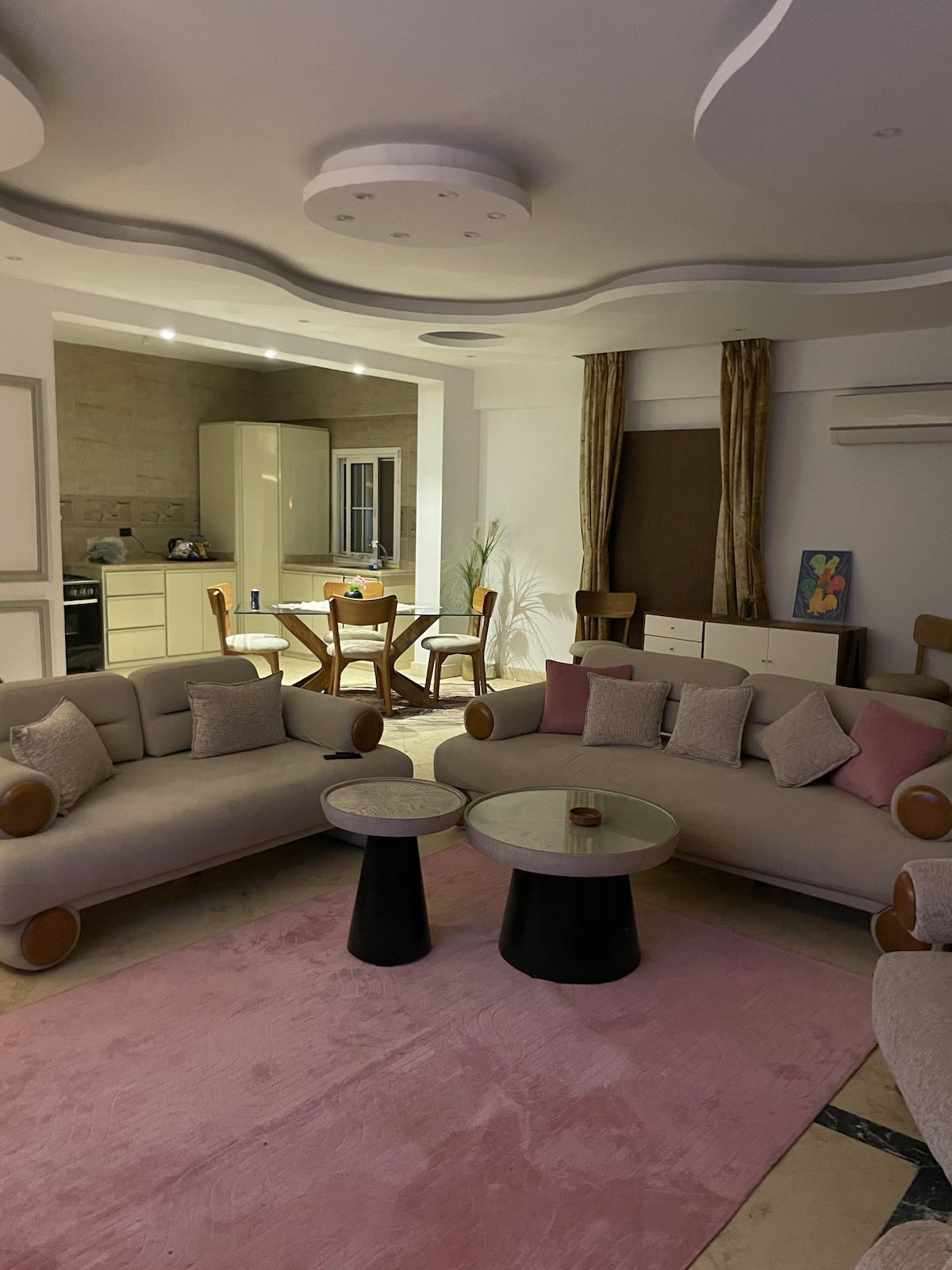 Welcome to unique apartment in Elmaadi area! This elegant apartment features two spacious bedrooms, one with an en suite bathroom, and a generous living room area comprising a dining room, a TV room, and a stylish saloon room. The interior is adorned in slick white, creating a modern and sophisticated ambiance.