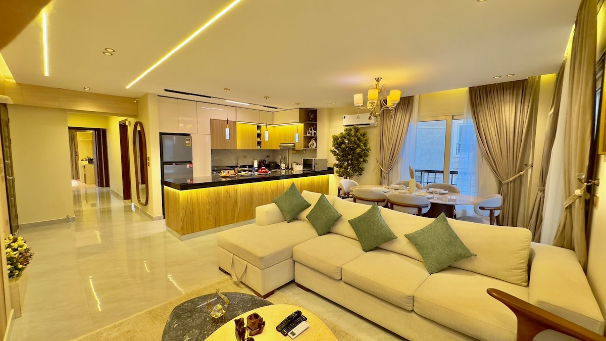 Enjoy the resort luxury living where lush greenery walks has no end while creating a memorable relaxation and enjoyable moments in the 3 high end pools including all ages and adults only pools, along with being close to all the city attractions points where famous shopping malls, it’s 25 minutes away from the Grand Egyptian Museum by Ubers! Our apartment is located in the heart of one of the most well known luxurious residential compounds where you can roam or have a lovely walk anytime safely!