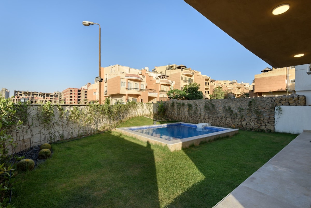 After a heavy day exploring Cairo or the ancient sites, come back to this house. Sink into the hammock under swaying palm trees, take a slow dip in the shared pool, or simply sit in the garden as the evening settles in 🏝️ ✨A calm, beautifully designed, 4-bedroom, 2-floor villa sanctuary, in a secure gated community, just 4 km from the Pyramids and Grand Egyptian Museum. Designed for families, remote workers & inspiration seekers!