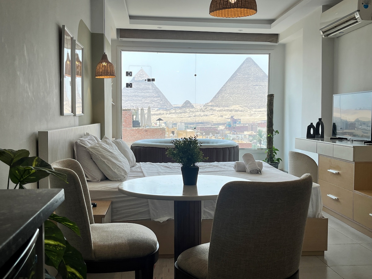 Welcome to our exquisite studio in the heart of the Pyramids area in Giza! Immerse yourself in the magic of ancient Egypt while enjoying modern comforts in our thoughtfully designed 32 sqm minimalist oasis. With stunning panoramic views of the iconic Pyramids of Giza right from your window, you're in for an unforgettable stay.