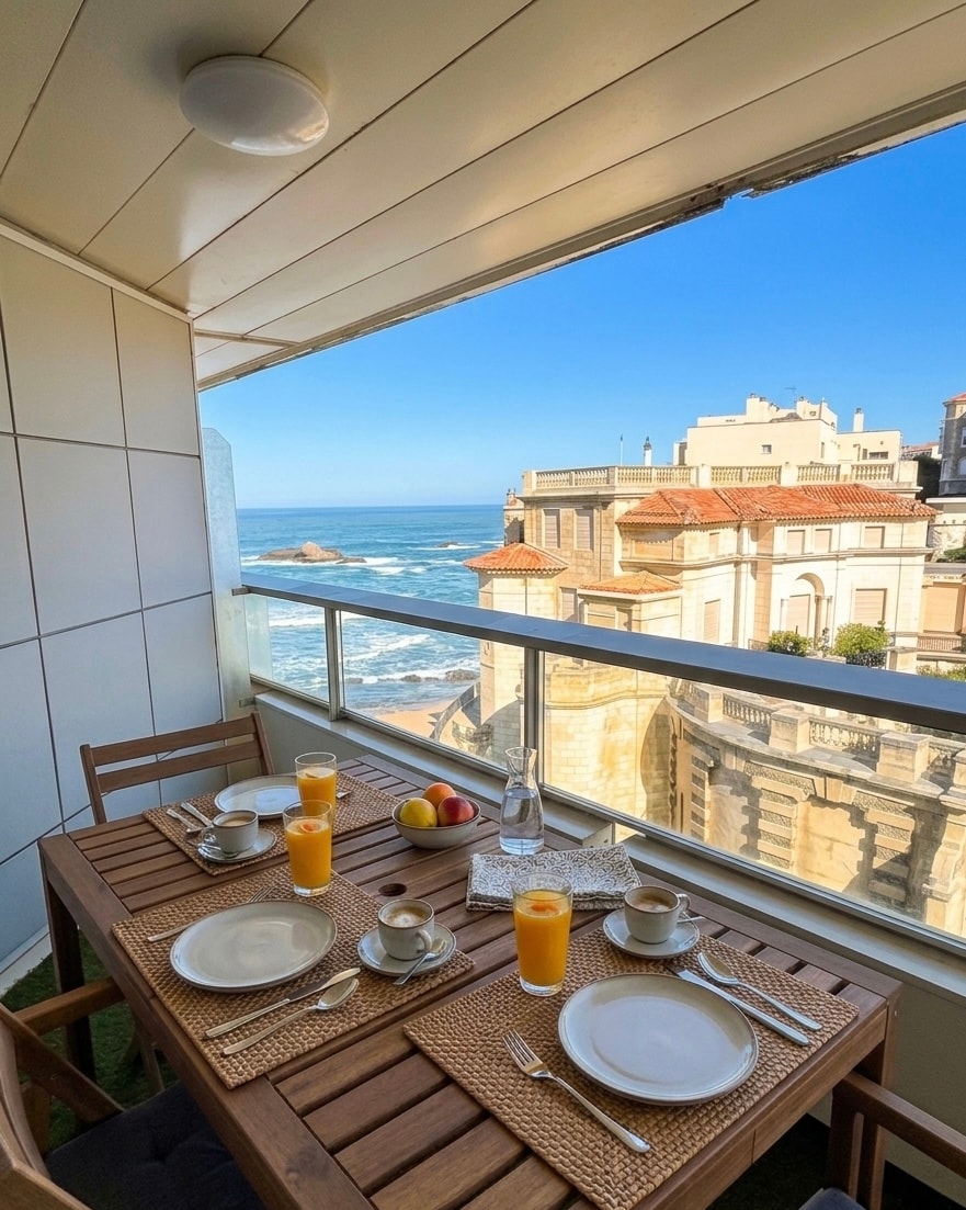 Cet appartement de la splendide Villa Mira-Sol, baigné de lumière, vous livrera une magnifique vue sur la baie de Biarritz, du Rocher de la Vierge au Phare. Le coucher de soleil sera au rendez-vous chaque soir. Ce cocon tout confort et insonorisé est en parfait état, récemment redécoré dans un style sobre et élégant, avec conception d'un espace repas sur estrade-promontoire en face des vagues. Pour les rejoindre, 2mn30 seulement vous seront nécessaires par un chemin piétonnier jusqu’à la plage !