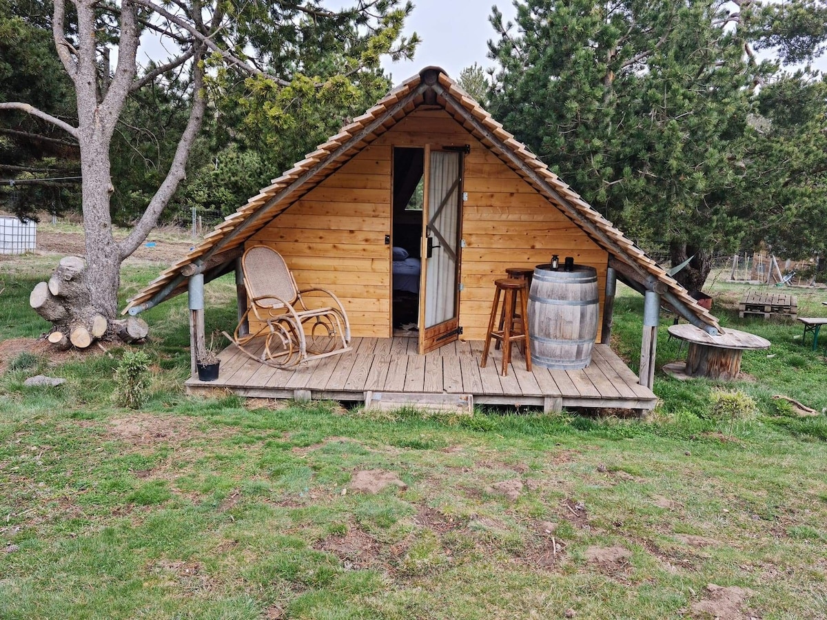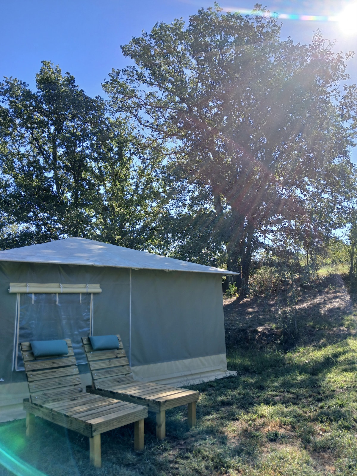 Camping à la ferme avec 5 bungalows toilés et 1 emplacement pour tente personnelle. Chaque bungalow a son jardin bien délimité , une terrasse, 2 chambres, et un espace cuisine sans eau courante mais avec rechaud et réfrigérateur, et donc électricité ( lampes, prises, ventilateur ). Vous trouverez les lits équipés de draps housses, couvertures, et oreillers avec taies Ambiance familiale dans le camping. Espaces partagés : toilettes, salle commune, piscine, barbecue, terrain jeux pétanque