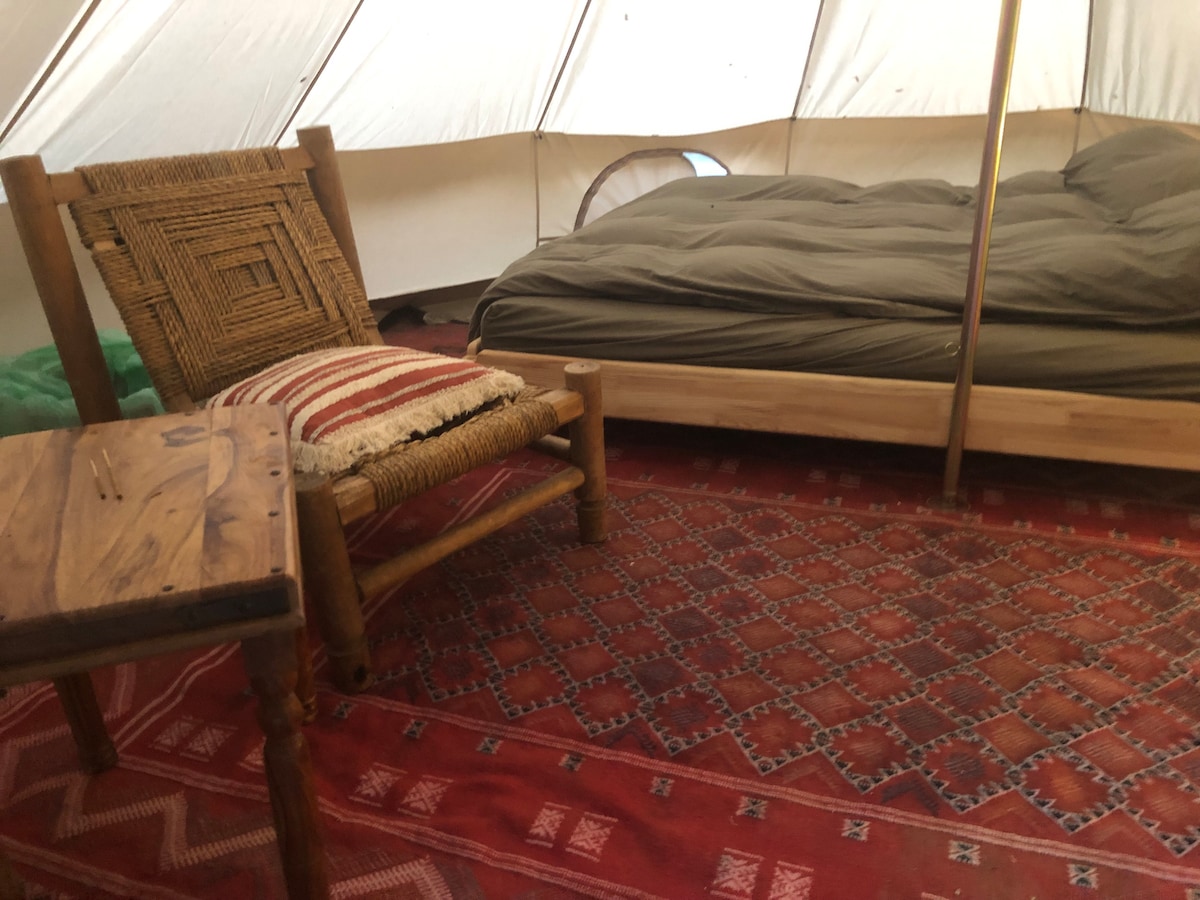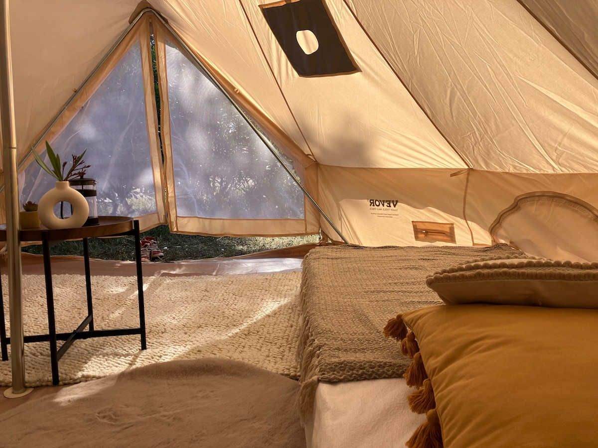 Tente cloche style yourte. Venez découvrir l'expérience Glamping tout confort en bénéficiant des services du camping à 50m de la plage. Couchage 2 personnes (2 matelas 70x200). Veuillez porter vos draps et sacs de couchage. (Option literie possible : 15 euro). Moustiquaire, verrous sur fermeture éclair, petit ameublement, espace salon intérieur et extérieur ombragé. Frigo commun, petite vaisselle et ustensiles disponibles. 3 logements similaires dans même zone si besoin