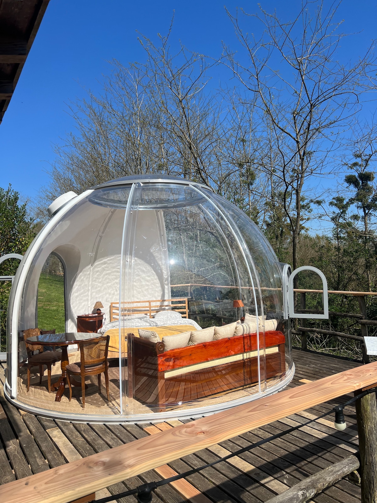 Laissez vous tenter par l'expérience d'une nuit magique et atypique dans notre bulle située au coeur de la campagne basque. Son dôme transparent vous offre la possibilité de passer une nuit à la belle étoile dans une ambiance chaleureuse et confortable. La douche et les toilettes sèches se cachent dans un chalet attenant à la bulle, le tout sur une terrasse équipée de transats, d'une table et deux chaises pour diner ou déjeuner aux chants des oiseaux.