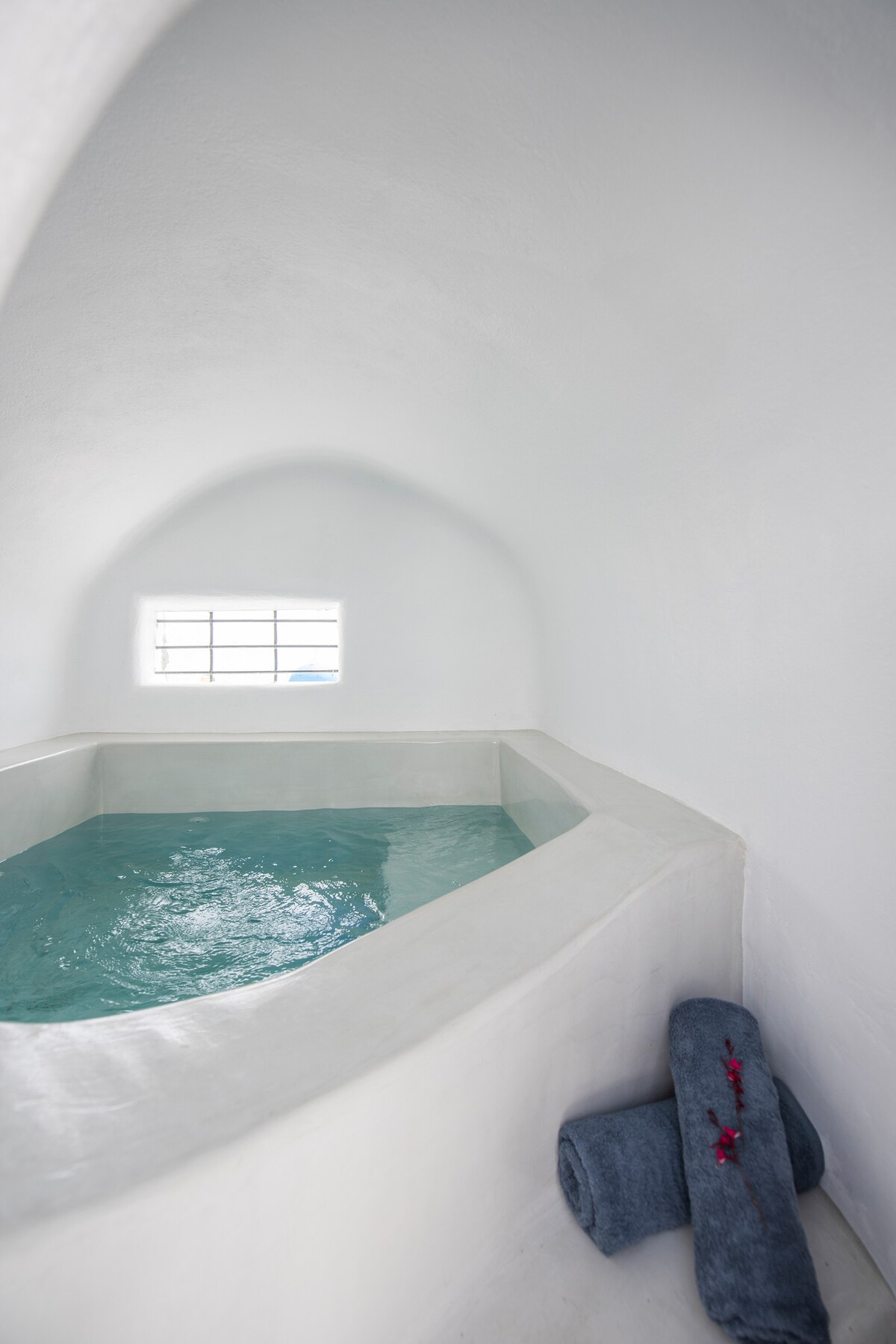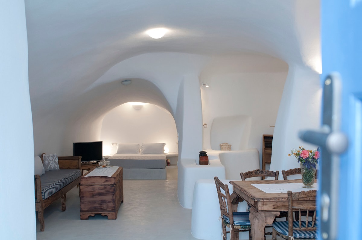 Anemos suite is located in Akrotiri overlooking the caldera and the volcanic islands . It is a suite with Private, Infinity heated Cave style plunge pool with Jet system and private patio. There is a king size bed that can accommodate two person. Daily breakfast is included and served in your suite . There is a cleaning service included. Inform us about your arrival details in advance , we can arrange a taxi/transfer for you.