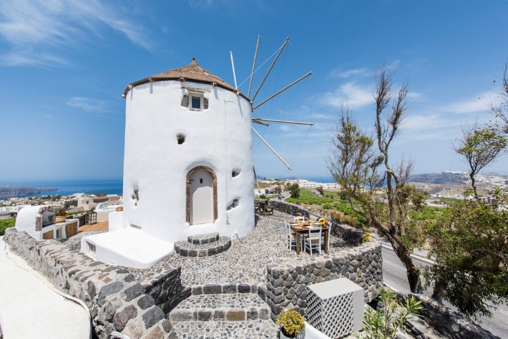 Continually awarded the best sunset in the world, Oia in Santorini draws travelers from all over the world just to see this magnificent sight. Now imagine being able to see this world class view from where you are staying, a luxurious retreat carved out of a white washed windmill that Santorini is famous for. Staying in a windmill is an escape from reality and a trip to fantasy. The design does not compromise in luxury and modern comforts and the sophisticated style will appease even the most demanding visitors. The ground floor showcases views of the vineyards, the swimming pool and the Aegean sea and contains the living room, dining room, and the kitchen. Amble up the spiral staircase to the second floor and relax in the sexond floor bedroom, a cone shaped room with an ensuite that leaves you plenty of space to move freely around the room. The swimming pool in a shape of a bean offers an ideal hydro-massage for 4 persons and is located near a pergola in the shadow of which you may enjoy your breakfast or meals. The uniqueness of this listing, combined with the quietness of the islands and unforgettable Greek hospitality will leave you with memories that you will remember forever. Kitchen • Ceramic kitchen and stove • Cooker- hood • Electric fridge • Dish- washer • Filter coffee maker • Espresso coffee maker • Toaster • A/C (hot- cold) Bedrooms - W.C. • Ecological mattresses- upper mattresses • Feather-pillows • Slippers • Bath towels • Ecological shampoo and "Apivita" body wash • Hair- dryer • Safe deposit boxes • Shaver point • A/C Living room • Satellite television • JBL docking station • Telephone • Access to the Internet • A/C Services • Daily maid service • Daily in-house served breakfast • Running of the property: Swimming pool, maintenance of the house, gardener, etc • Complimentary wine and fruit upon arrival Pool • Pool with hydromassage for 4 persons