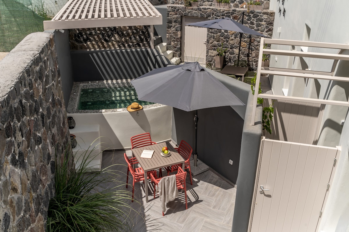 Martynou View Suite is a private property, located in Santorini Pyrgos village.Just a few steps away from restaurants cafe and more shops.Only 10 minutes driving distance from central Fira and the best beaches.This is an ideal choice for couples or small families.Suite offers private parking,a spacious living room with a kitchen, bathroom,double bed,air condition,coffee machine, 2 smart TV,fridge(offer bread jam honey butter),Wi-fi, and a private heated mini pool(jacuzzi)with stunning sea views!