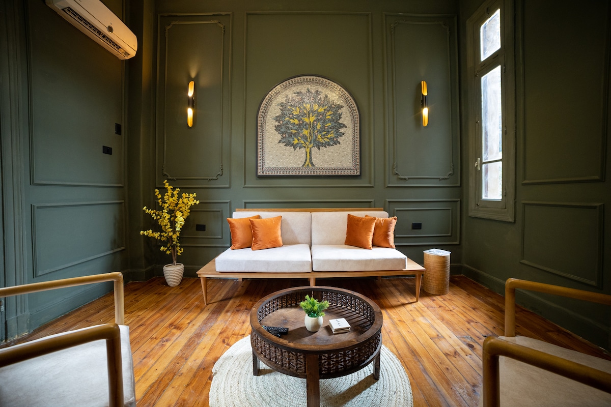 Book an enchanting getaway in this grand two-bedroom gem ornamented with vintage artwork and treasures collected from our world travels. Stay just steps away from Cairo's major museums, monuments, and landmarks while feeling like you are embedded in the culture. Everything in the space was designed specifically for the space and for you to have an artistic experience. Great for groups of friends, couples, or families.