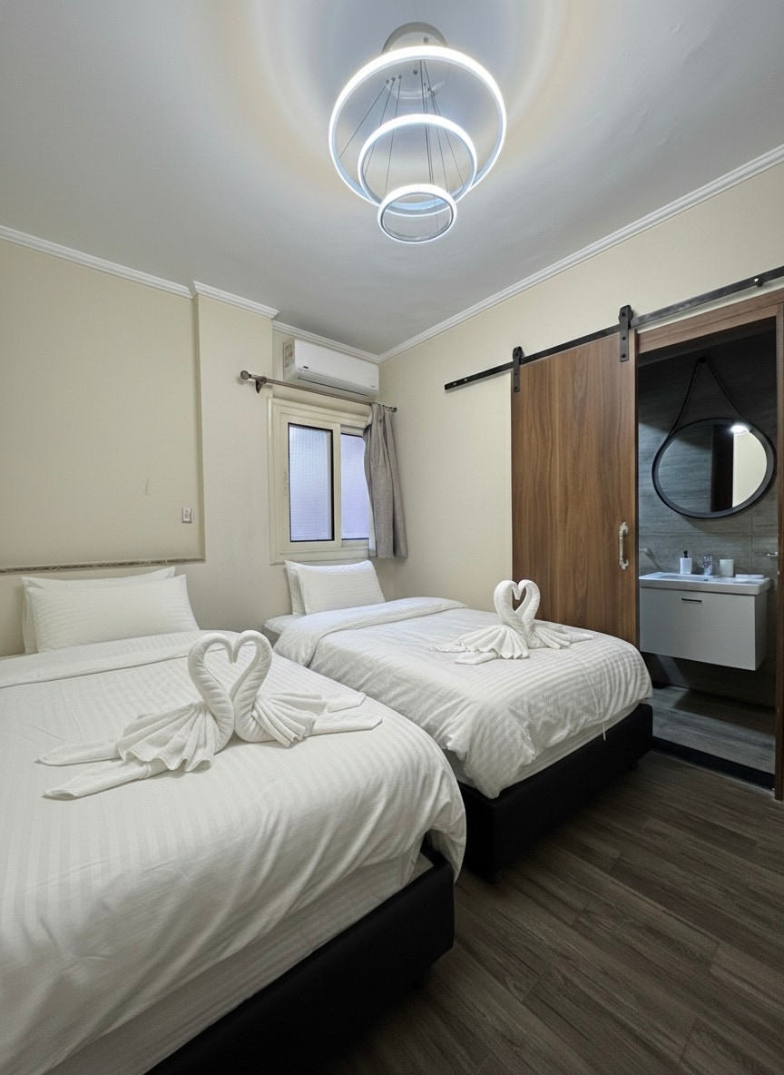 Spacious 3-Bed, 3-Bath in Historic Downtown Cairo – Perfect for families or groups, this stylish apartment combines three private studios into one home. Each bedroom has a queen bed, modern bathroom, powerful AC, and full-length mirror. Enjoy cozy seating, well-equipped kitchenettes, laundry, and extra fold-out cots. Relax on the shared patio and step outside to top attractions like the Egyptian Museum and Tahrir Square—more comfort and privacy than a hotel, for less.