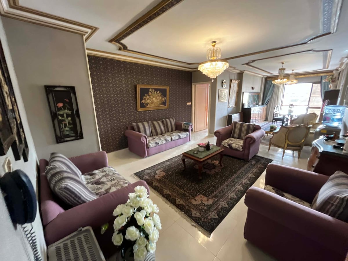 A magnificent panoramic view overlooking the heart of Cairo downtown from the ninth floor. A spacious 280 meters square flat. All the bedrooms have a view with access to the most enchanting balcony in Cairo! Egyptian Art, world heritage paintings, Flowers and plants in every corner. The charm of the vintage mixed with the comfort of the contemporary! Cozy and friendly as home, Stylish and luxurious as hotels. For a memorable time in Cairo, we invite you to be our guests