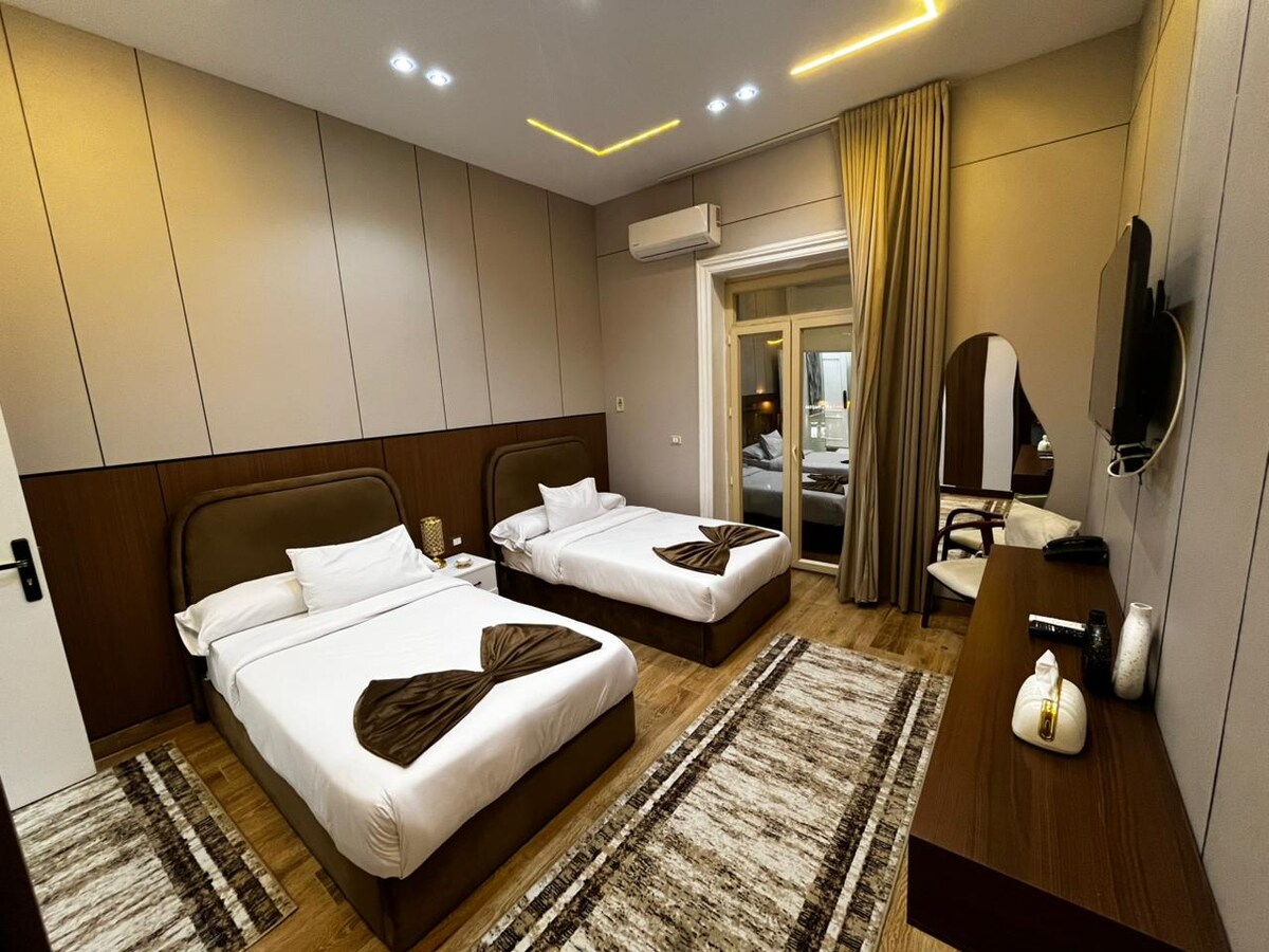 Elegant Downtown apartment with stunning square views, 2 suites + 2 bedrooms, hosting up to 8 guests. 3rd floor (no lift) with luggage assistance; earplugs provided to ensure a peaceful stay despite the vibrant city outside. Steps from cafés, bars, the Egyptian Museum, and Sadat Metro Station. Passports scanned copies should be provided upon booking. Note: Egyptian & Arab couples must provide a marriage certificate. Only approved visitors allowed. Parties not allowed.