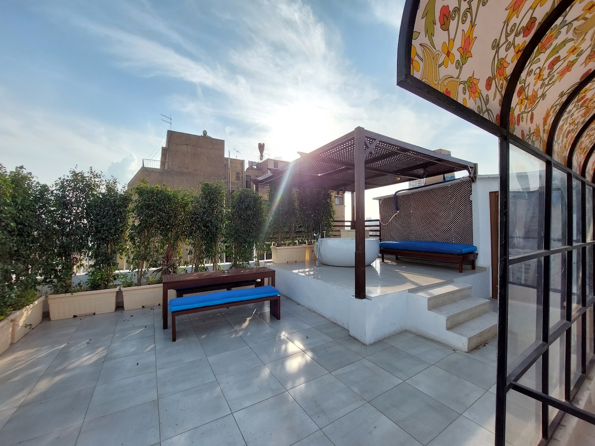 A full apartment in a spacious Secret Garden rooftop with panoramic sunrises, blue skies & full moons in Cairo’s Downtown heritage center, just minute’s walk from markets, tourist attractions & central metro station. This newly renovated 70s apartment is minimalist, modern yet warm, a one-of-a-kind designer space in the heart of the capital, combining both urban & natural elements of Mediterranean architecture. As superhosts & artists we always try our best to make your stay a memorable one.