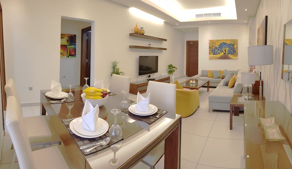 It is located on top of a Mall, where you can find 20 restaurants and more than 100 shop. Carrefour supermarket is offering you to get your trolley from the mall till your flat. Below are included: - 24/7 Security guards and concierge - Cleaning once Weekly ( for weekly stay only ) - Gym, Swimming Pool, Sauna, Steam, Tennis and kids' outdoor playing area - Hand Soap, Body soap, conditioner, Shampoo, Bed sheets, tooth brush, slippers, shaving kit and fresh Towels - Drinking water - Free WIFI