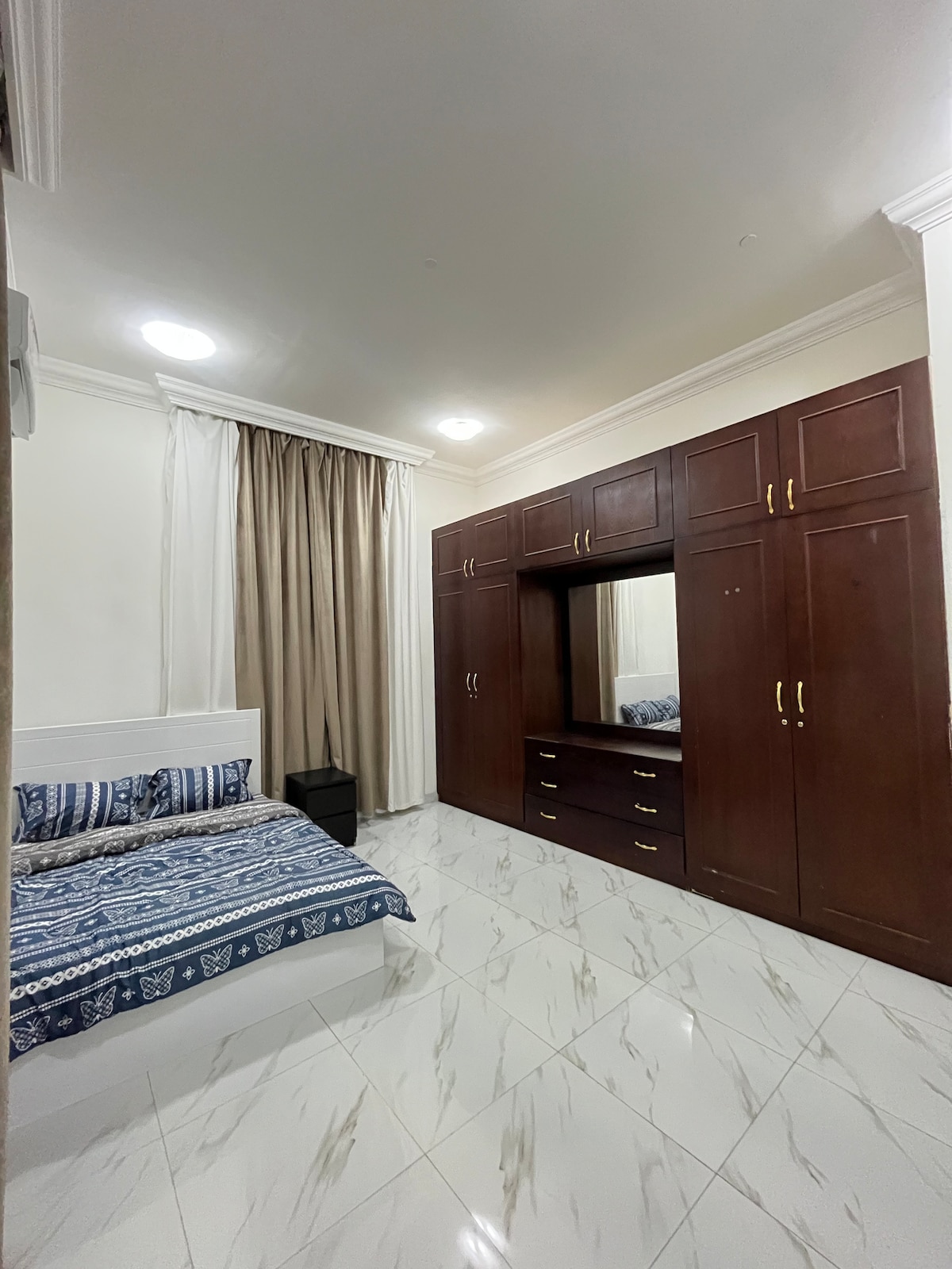 Spacious guest suite in light colors. It is attached to the main family house. It has private entrance & and outdoors space used only by the guest. Brand new. Just completed recently. Duhail area, near North Atlantic College, Lekhwia Sport Club.