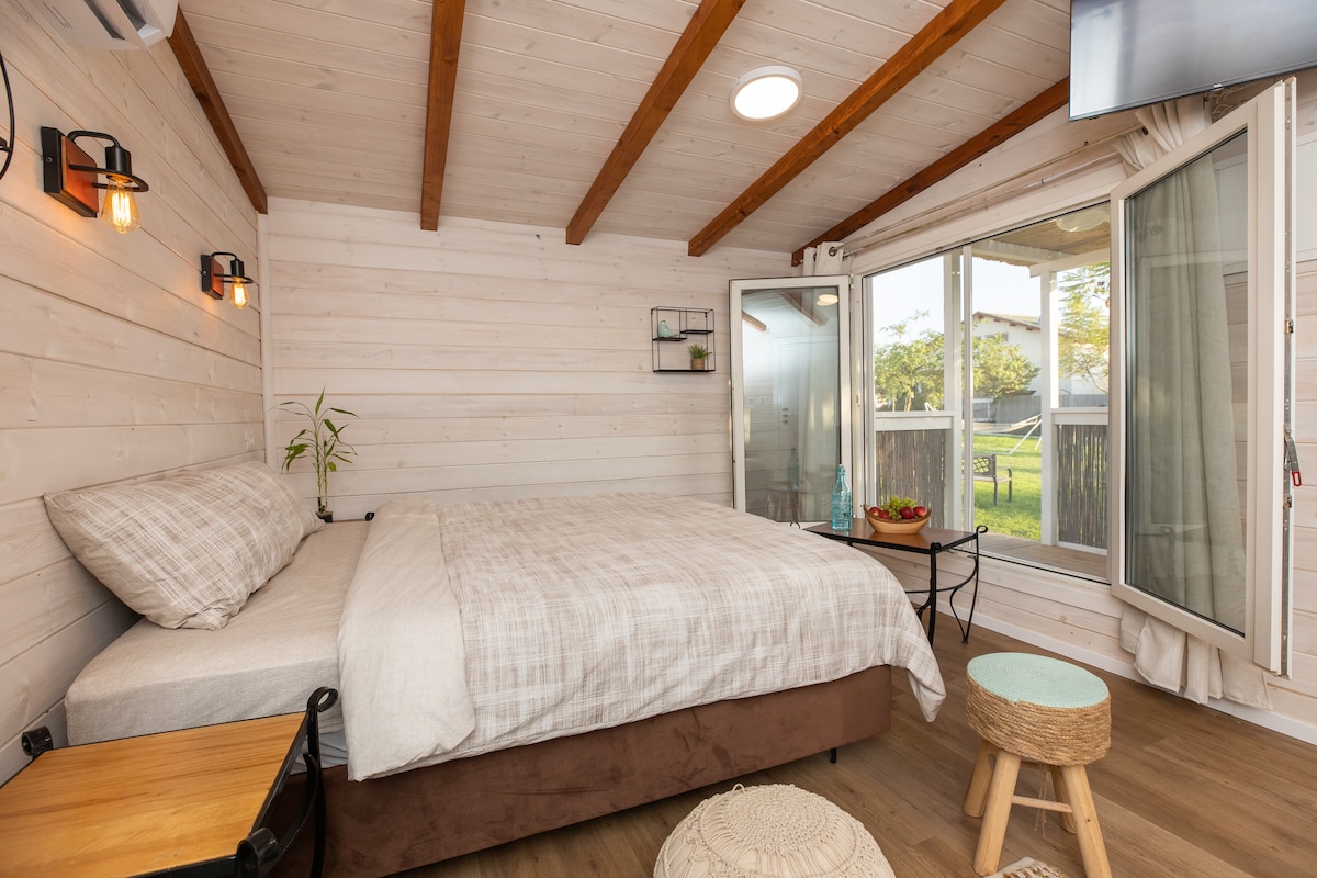 Modern and cozy caravan near Lake Ram with stunning views of Mount Hermon. Enjoy a heated wooden hot tub, a telescope for stargazing, a seating area, and a BBQ station. Inside, you’ll find a comfortable double bed, a fully equipped kitchen, a private bathroom, and air conditioning. Perfect for a quiet and romantic getaway in the Golan Heights.