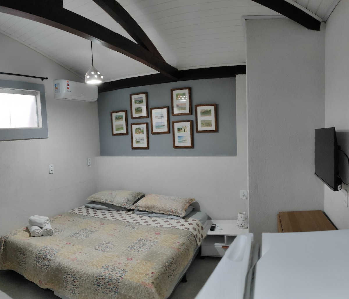 Estúdio em condomínio, a 4 km do Quadrado e praias. Cama confortável, cozinha equipada, ar-condicionado, Wi-Fi, Smart TV e vaga. Perfeito para casais e viajantes solo. Banheiro privativo, cozinha completa. Roupas de cama/banho premium . Secador de cabelo e ferro de passar roupas Não nos responsabilizamos por objetos esquecidos no estúdio Será solicitado nome completo dos hóspedes para entrada no condomínio