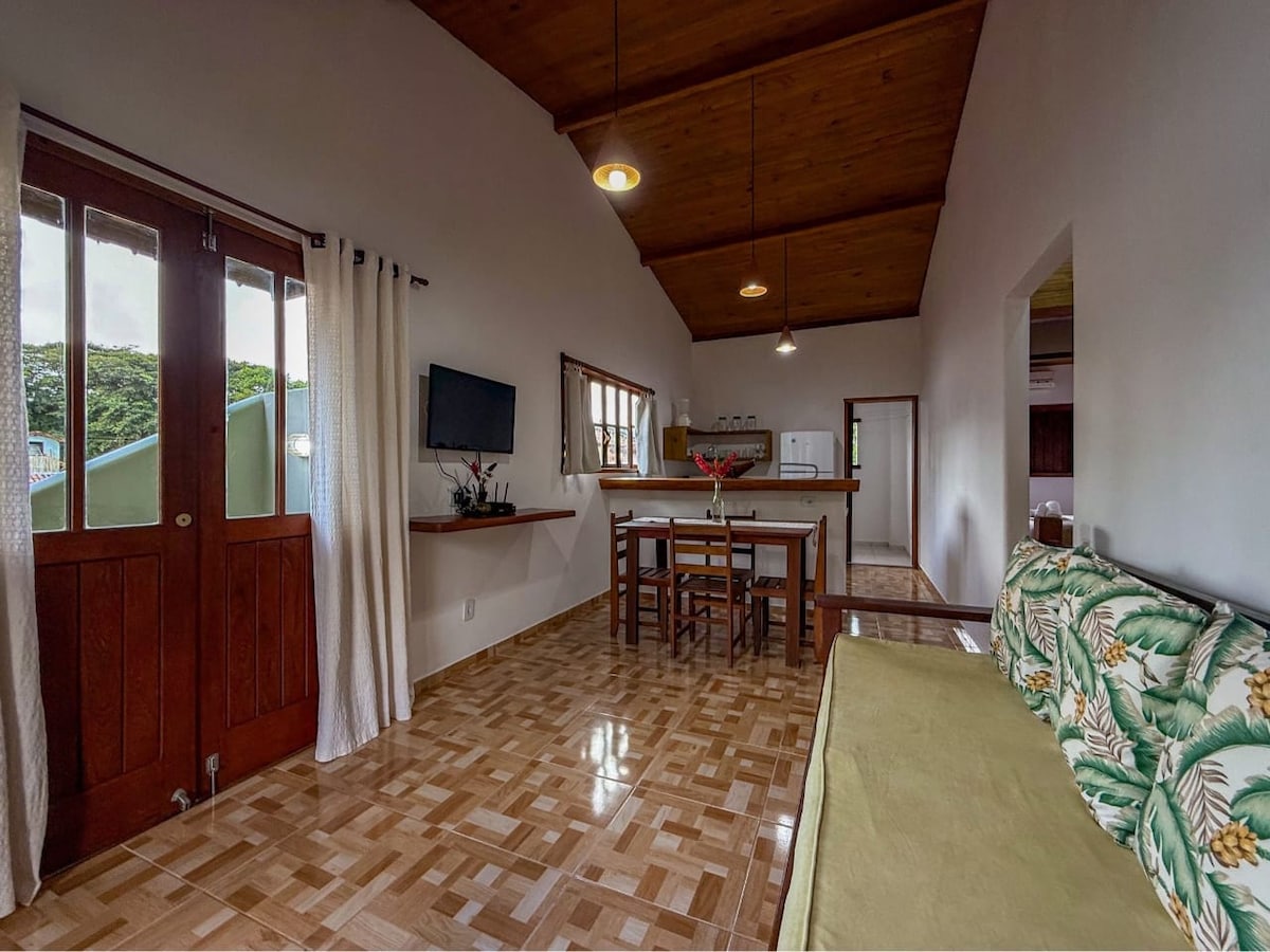 Aconchegante apartamento completo para 2/4 hospedes, em lindo e tranquilo condomínio fechado. Muito bem localizado no centro do Arraial d'Ajuda bem próximo a vários tipos de comércios e a charmosa rua do Mucugê (5 min a pé ), e possível deixar o carro no estacionamento e sair andando tanto durante o dia que a noite também. O condomínio e construído sobre uma área em desnível por tanto tem uma escadaria ao longo do caminho que leva até o apto. Insta @VilaZion