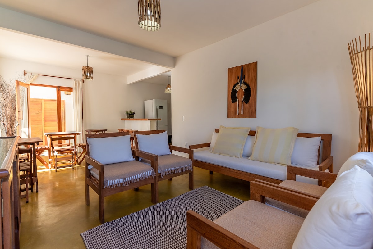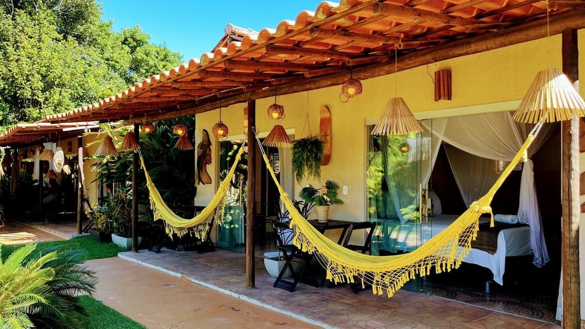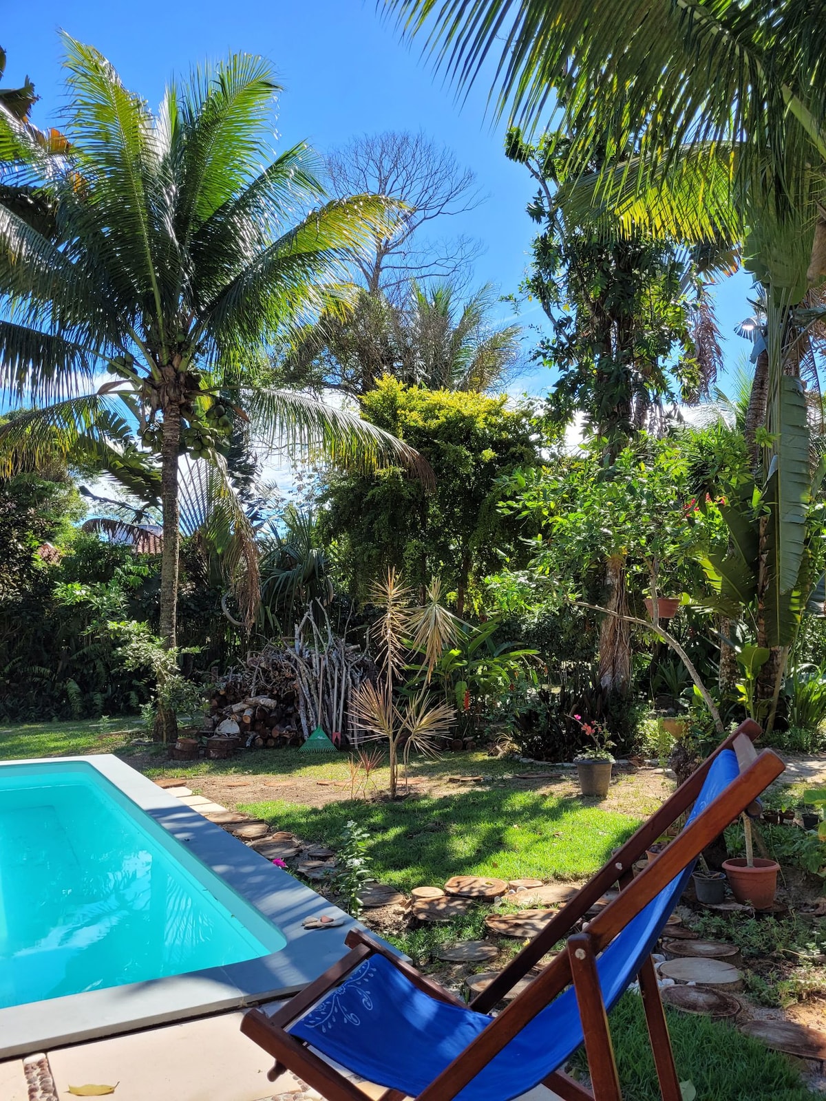 Bangalô privativo para até 3 pessoas, com cama queen + solteiro, ar-condicionado, Smart TV, frigobar e banheiro completo. Varanda exclusiva com rede e mesa. Piscina em jardim tropical, cozinha equipada e área de jantar compartilhada. Localização estratégica: a poucos minutos da Praia da Pitinga, Parracho, Mucugê e centro histórico. Atmosfera autêntica, decoração artesanal e privacidade para aproveitar Arraial d’Ajuda no seu ritmo.
