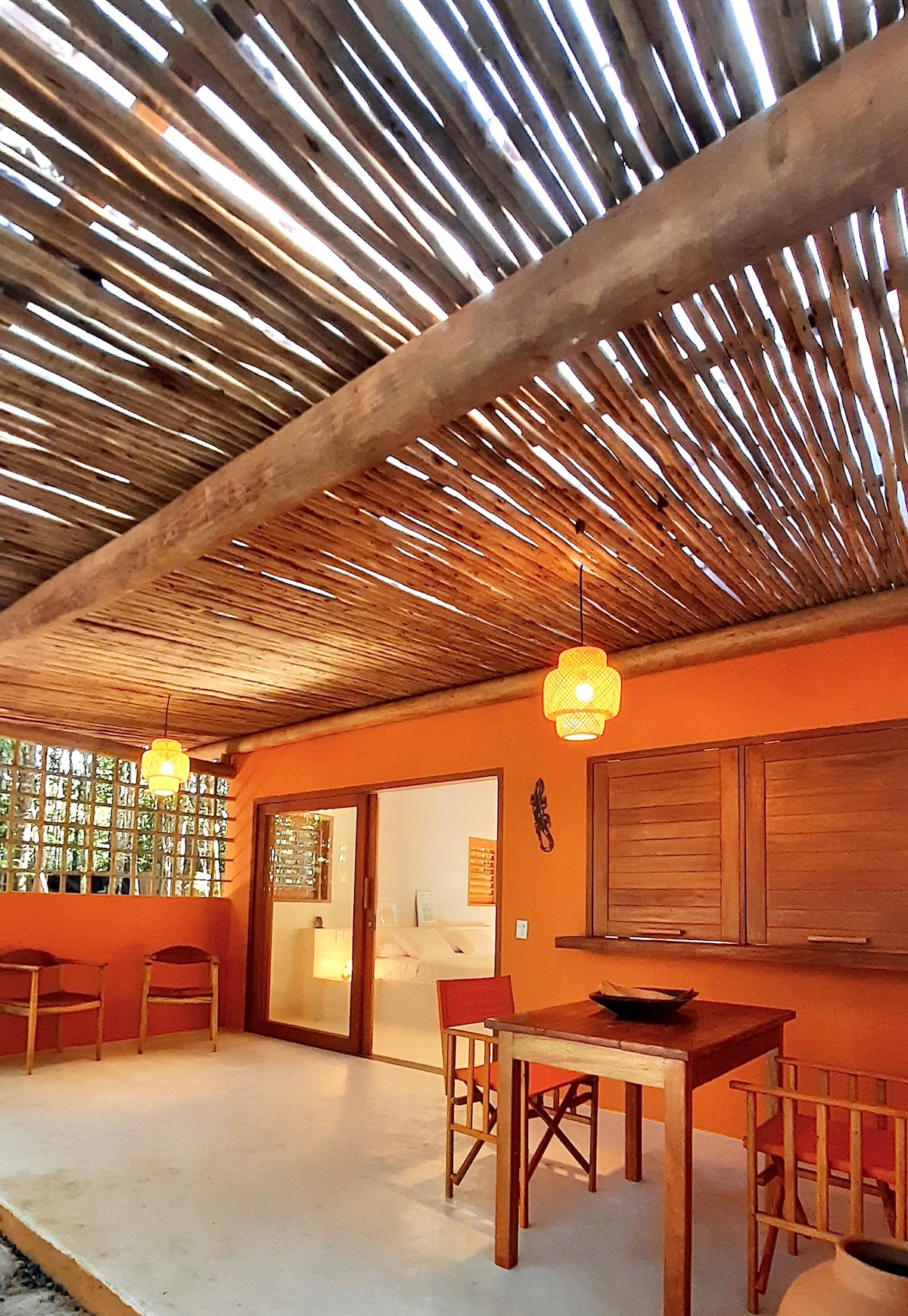 Trancoso has always attracted nature lovers, at Casa Pequi the living trees are highlighted in the contours of the garden or blend into the house. Rustic furniture with a natural design made from raw materials found in the forest. Facade in Santa Fé plaster, the same coating as the Igrejinha do Quadrado, which at the time was made with sand, salt water, and whale oil. This entire concept takes you to a unique regional experience, in the middle of a preserved Atlantic Forest reserve in the heart.