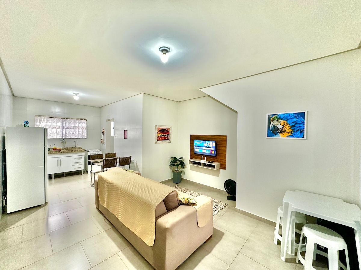 Apartamento térreo amplo e confortável com varanda, sala com bicama e auxiliar com colchão de solteiro, mesa de jantar, quarto com cama casal e cama solteiro, ar condicionado, banheiro social, cozinha equipada com utensílios para as necessidades diárias, área de lavar roupas e quintal amplo com varal.