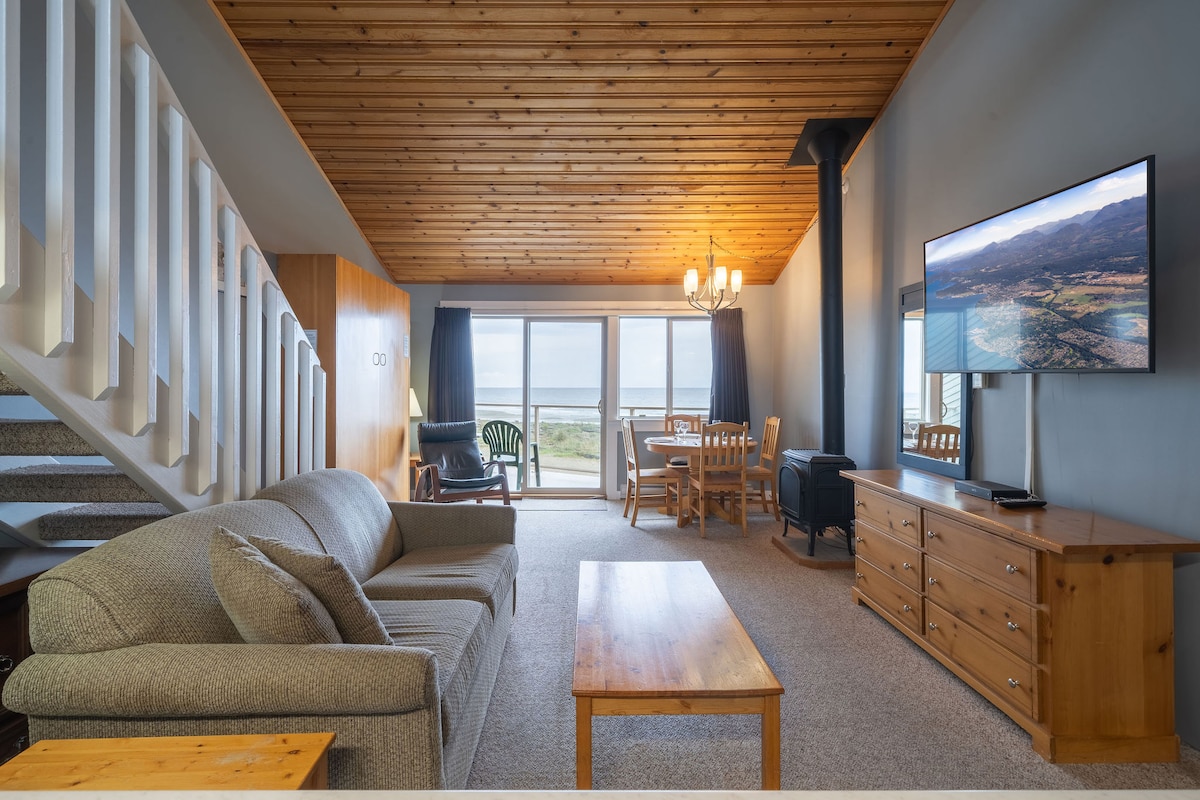 Nestled along the shores of beautiful Craig Bay, our 2 Bedroom Oceanfront condo with Mountain Views is a privately owned townhouse located in Pacific Shores resort. Walk out the door and enjoy a stroll on the beach or enjoy a cocktail while taking in the sunset on our private deck. Use of all resort amenities including indoor pool (closed Mondays) and hot tub, fitness room, games room and kayaks are included in the price of your stay!
