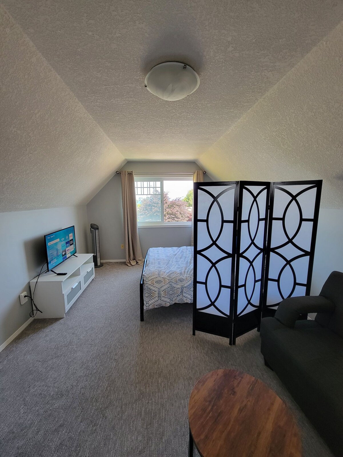 A licensed clean cozy convenient micro studio + private bathroom and entrance - easy self check-in, free parking, full-sized bed (54" x 75", fits a solo or slim duo), near downtown, VIU, schools, hospital, sports arenas, ferries, 4 bus routes nearby, embraced by beautiful parks and trails, pretty mountain view. drive 5 mins or walk 20 mins to downtown/waterfront/VIU, drive 10 mins to Departure Bay. Tip: book multiple nights to save on cleaning, as it is charged once per booking.