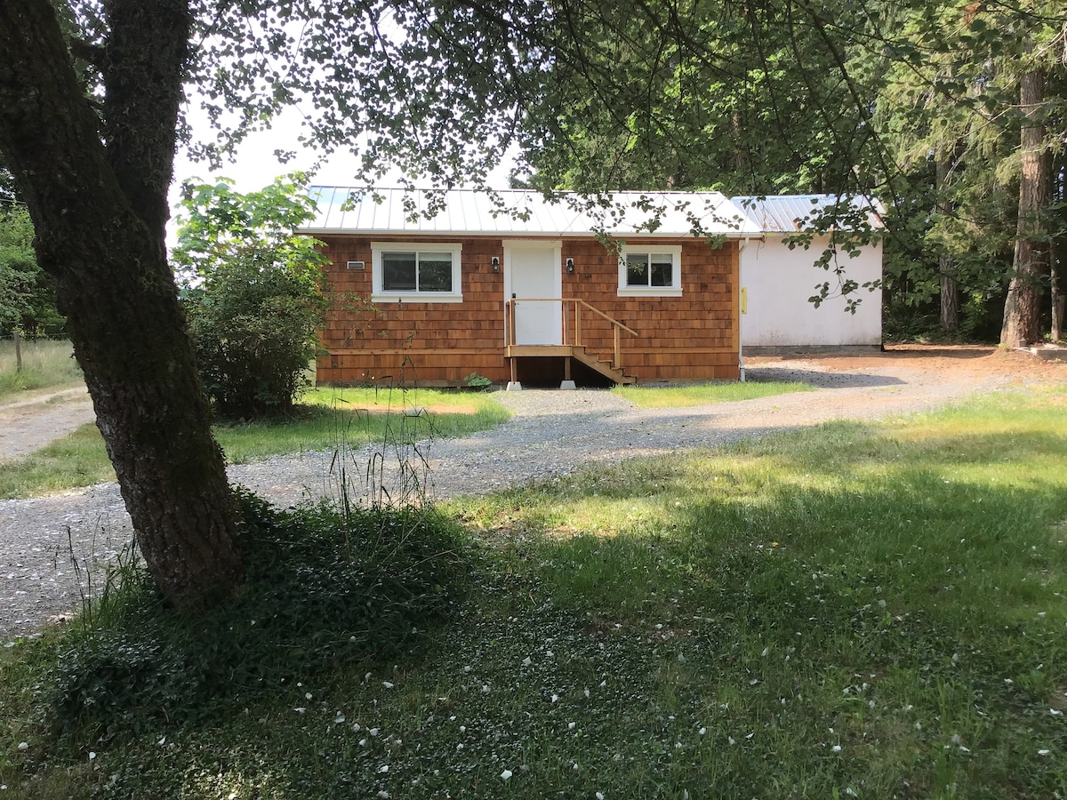 Welcome to a few days of relaxing. You're at the beach in 5 minutes or just step out the door to the forest. Sleep in, order a pizza and play a board game by the cozy woodstove. Put on your best duds for a dinner date down by the ocean. Maybe a fire in the backyard with a cup of cocoa? Full bathroom and everything you need for a tea or coffee and light breakfast. Mini fridge and microwave. Please note there is no kitchen and we live on the property with our blue heeler.