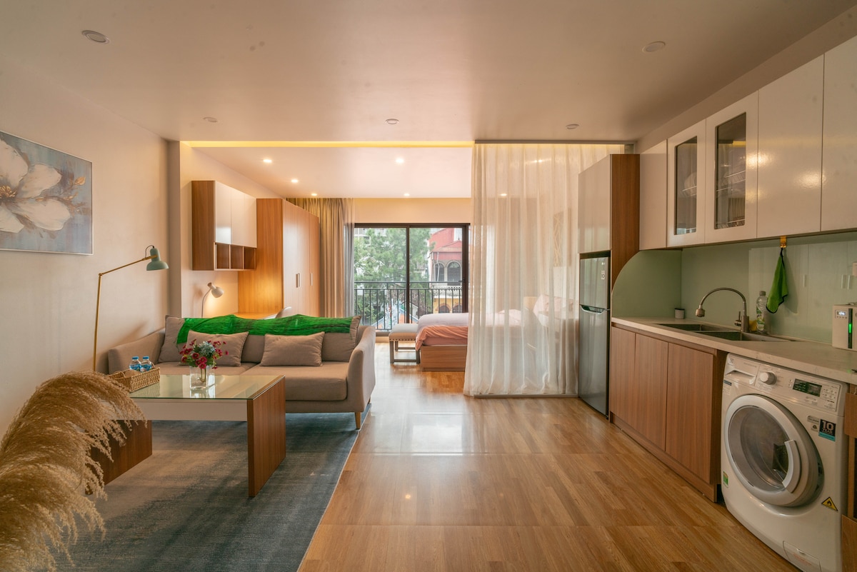Newly built building which is suitable for short to longterm rent, having a fully function private laundry plus kitchen and shared garden space for rental guests only. The house is located in the heart of Ba Dinh district, fully airy with big window and only takes 3 minutes walking to the West Lake, 15 mins to the Old Quarter via Grab/taxi (approx. $2-3) and Lotte Lieu Giai is 15 minute walk or a 3-minute taxi, or we also offer free airport drop off service for guests who stay more than 3 nights