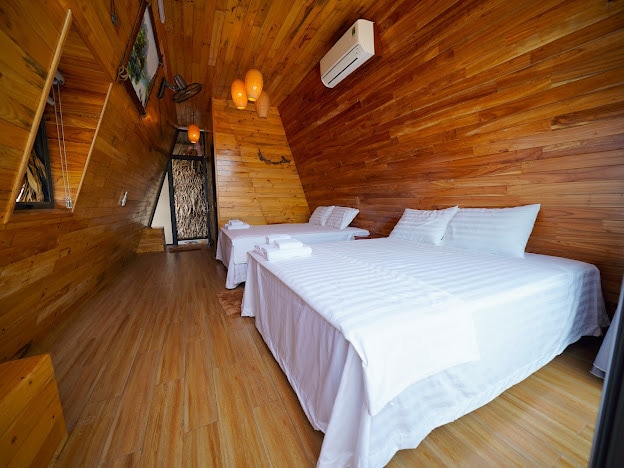 Với thiết kế gồm 2 căn Villa liền kề. Mỗi căn thiết kế 1 tầng với 4 phòng ngủ được trang bị đầy đủ tiện ích, nội thất và thiết kế hiện đại (phù hợp cho đoàn 10-12 người • Phòng family room vệ sinh khép kín: gồm 1 giường 1m8 phù hợp cho 2 người lớn và 1 em bé. • Phòng sweet room vệ sinh khép kín: gồm 1 giường 1m6 phù hợp cho 2 người • Phòng Happy room (vệ sinh ngoài): gồm 1 giường 1m6 phù hợp cho 2 người • Phòng tập thể ở gác lửng: gồm 2 nệm lớn phù hợp cho 4-5 người