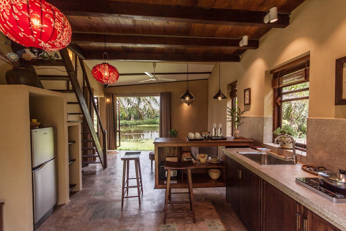 Nestled in a charming boutique resort by the bank of Co Co river, only 5-8 minute ride to Hoi An ancient town or many nearby beaches, Sukkha studio offers a self-contained yard complete with patio, chairs and Vietnamese traditional style outdoor kitchen. The bathroom features a private, outdoor shower, as well as large outdoor bathtub. The studio contains one queen-sized bed, kitchenette and sofa bed with living room. Ideally suited for a solo traveler or couple looking for a romantic vacation.