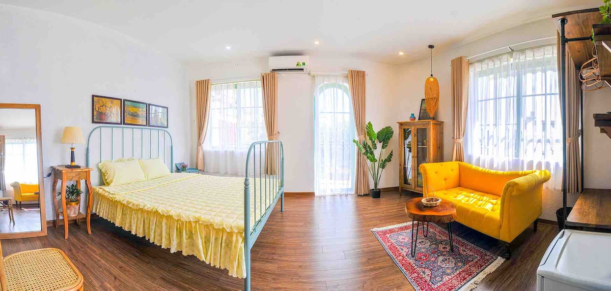 Looking for an eco-friendly home away from home? QCasa Mango is a stylish 3-bedroom villa tucked away in a farming village in the UNESCO-listed Hoi An. This solar-powered villa spans 3 floors, each offering wide, uninterrupted views of the surrounding rice fields. Depending on the season, you’ll wake up to green shoots or golden grains swaying in the breeze. It’s a calm, scenic setting ideal for relaxing or lounging by the pool under the sun. A great choice for a comfortable stay in Hoi An.