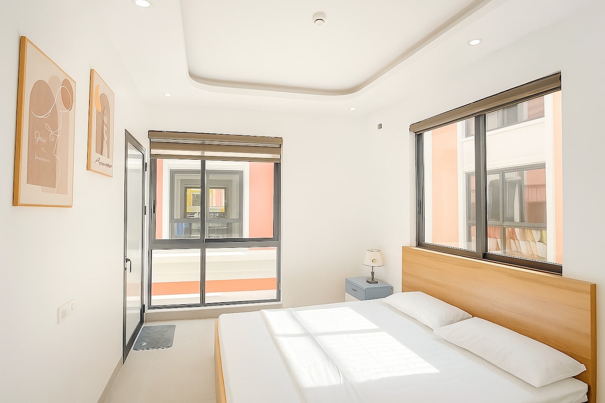 Phòng Deluxe rộng 20m² trên tầng 2 của căn nhà 4 tầng; phòng tắm riêng trong phòng; có ban công rộng rãi, yên tĩnh và tầm nhìn đẹp; thích hợp cho gia đình hoặc nhóm nhỏ, KHÔNG CÓ PHÒNG BẾP