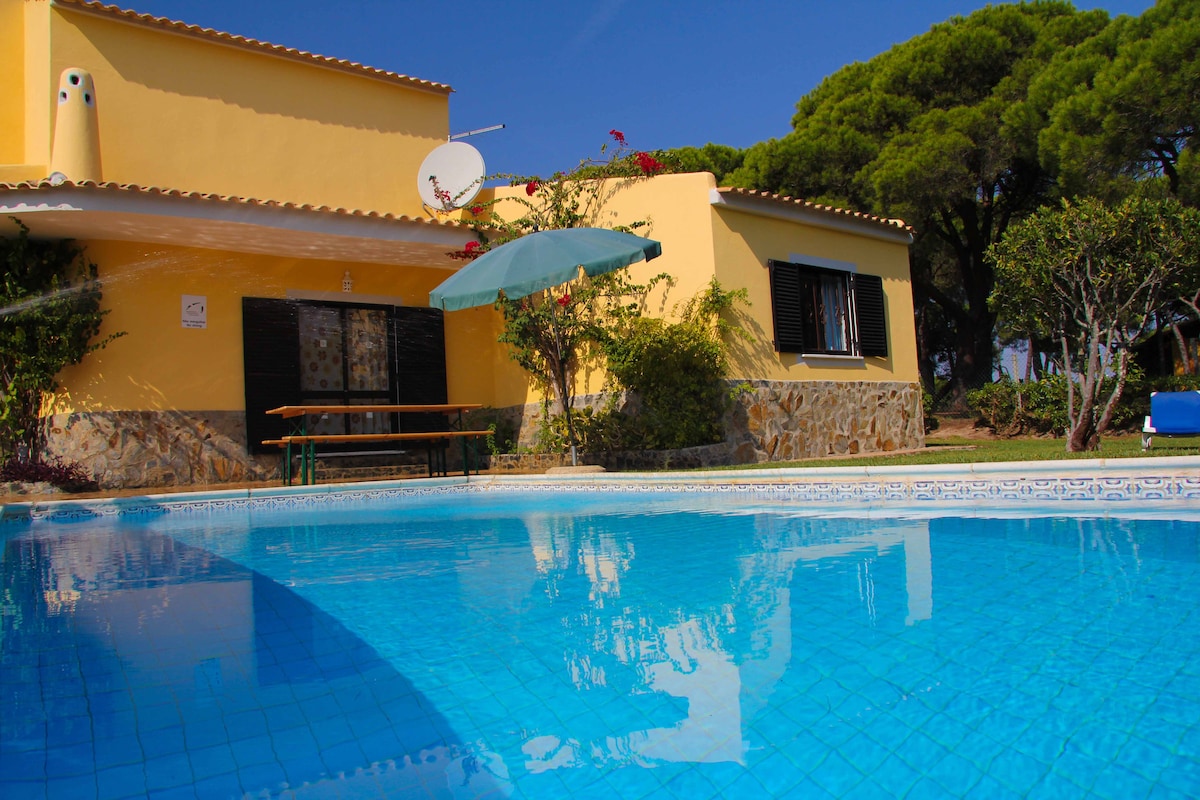 Localizada a +/- 20 minutos a pé, da Marina de Vilamoura, onde encontra excelentes restaurantes, bares e lojas. É uma moradia de um piso, geminada, com jardim e com uma PISCINA PRIVATIVA AQUECIDA. Está disponível com quatro quartos e três casa de banho. Tem ar condicionado na sala e nos quartos. A cozinha está equipada com maquinas da roupa e da louça, forno e micro-ondas. A piscina, agora vedada para a segurança de crianças, tem vista para um dos vários campos de golfe existentes em Vilamoura.