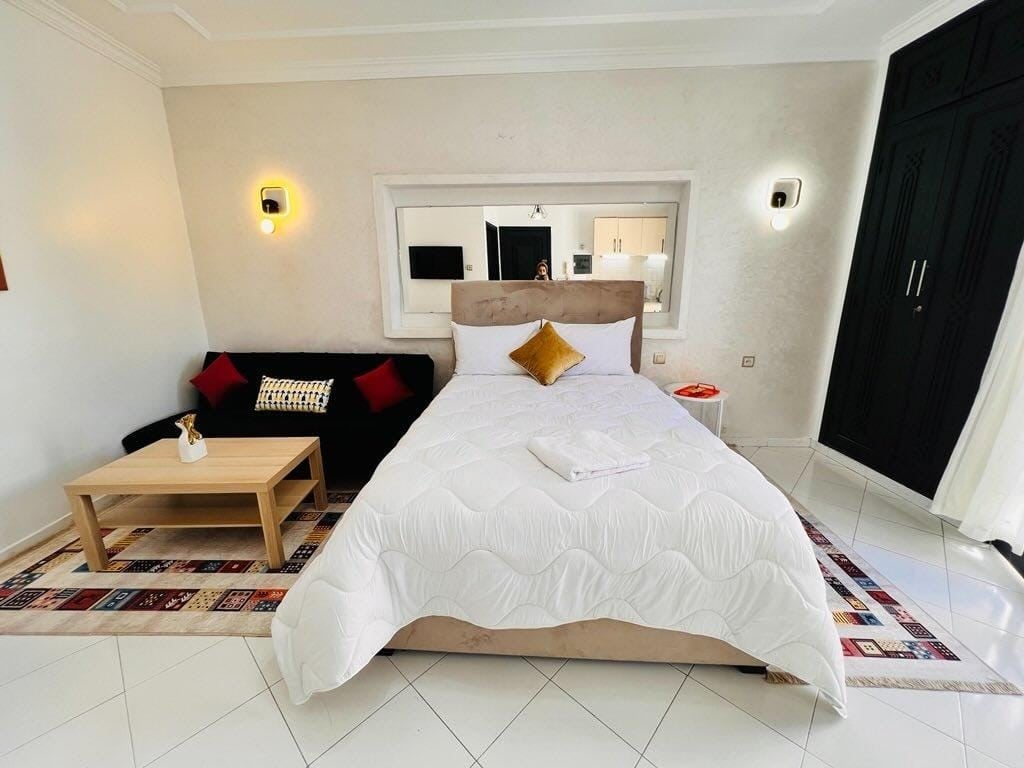 Experience modern comfort in this stylish studio, perfectly located in the heart of Rabat. Enjoy a bright and well-designed space featuring a cozy bed, a comfortable sofa, and a fully equipped kitchen. Perfect for travelers looking to explore, this apartment is just a 2-minute walk from the iconic Hassan Tower and 10 minutes from the lively Medina. The ideal base for discovering the city with ease!