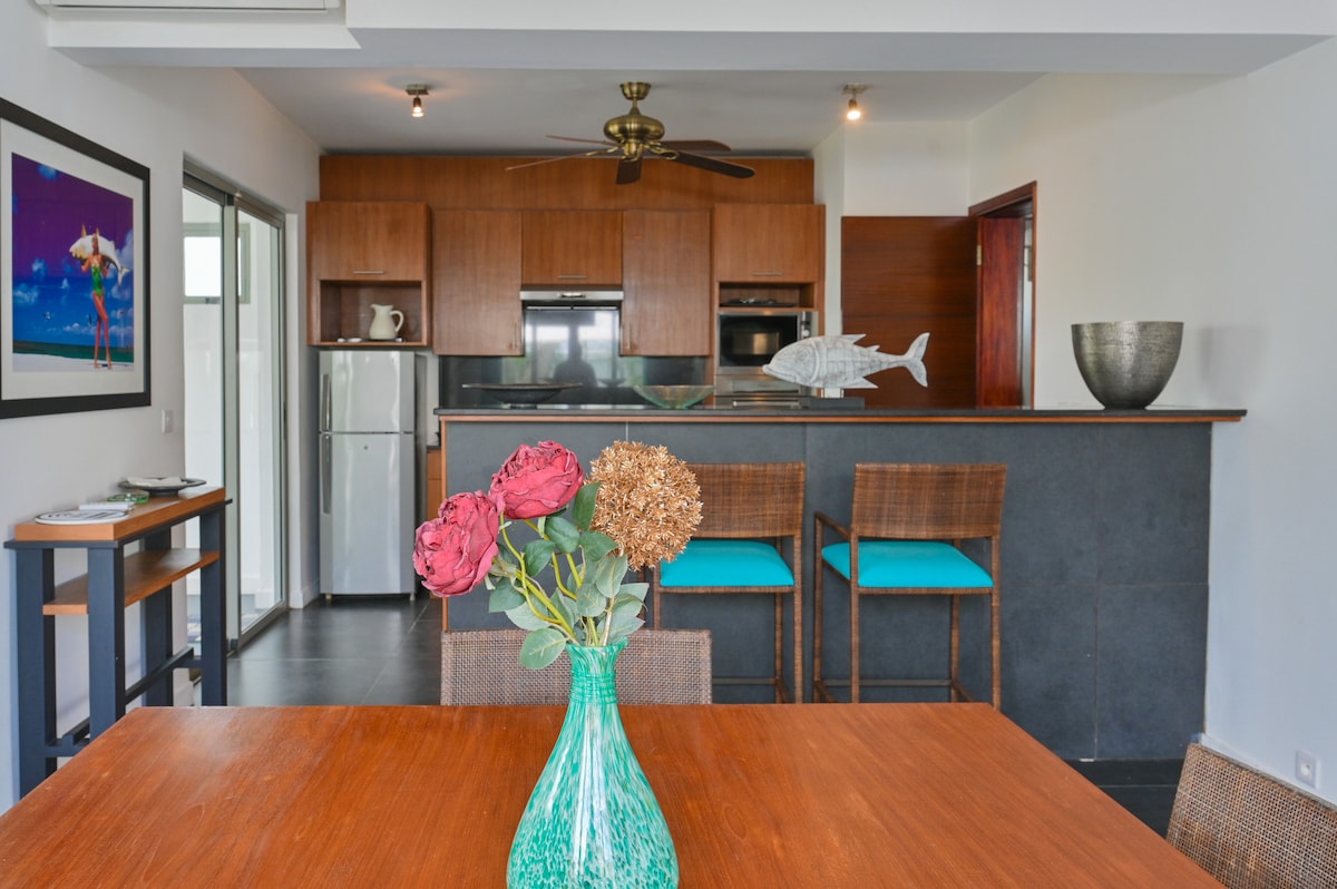 Cet appartement incarne le luxe tropical. Deux chambres en suite offrent intimité et confort, avec l'une donnant sur une piscine à débordement et sur l'océan. Le salon spacieux s'ouvre sur une terrasse où un coin repas extérieur invite à profiter du climat idyllique. La cuisine moderne est équipée pour répondre à tous les besoins culinaires. Les résidents bénéficient également d'un accès à une salle de sport bien équipée et d'un parking sécurisé, offrant un mode de vie exclusif et pratique.