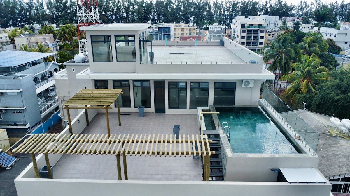 Newly built, contemporary, and unique one bedroom apartment in an ideal location just a few minutes walk to Flic en Flac beach, restaurants and shops. This spacious one bedroom apartment contains all the amenities required for a memorable stay. It contains several unique features such as a rooftop pool, small gym, an outdoor TV room, and an open space suitable for events.