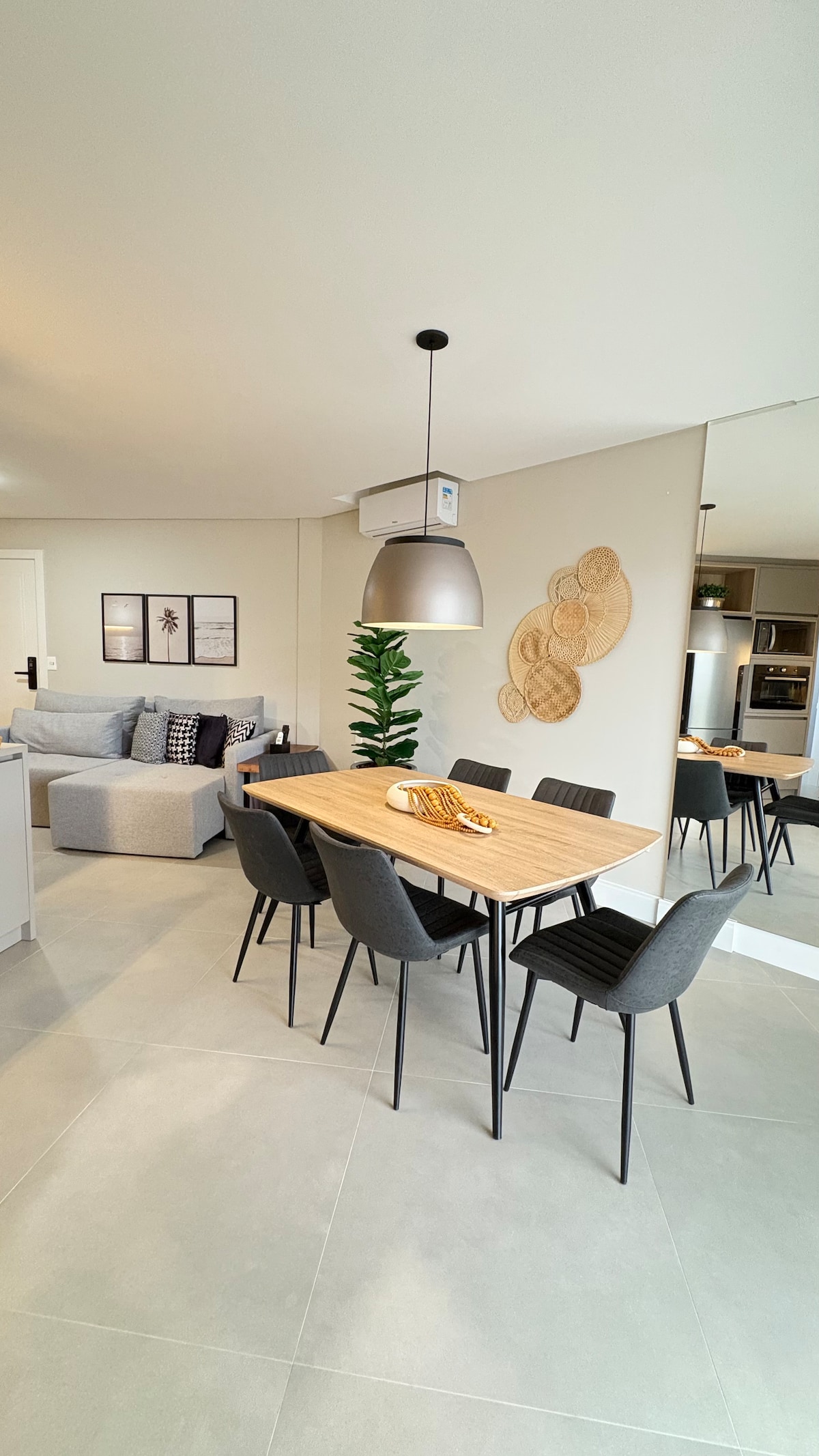 Modern and cozy apartment located in Residencial Sunny Flats, approximately 400 meters from Bombas beach in Bombinhas. It has a beautiful outdoor area with a swimming pool on the terrace, gourmet area, fire pit, games room, and kids' area. It has an integrated living room and kitchen with a dining table, a guest bathroom, 1 air-conditioned bedroom, a sofa bed in the living room, and a balcony with a private barbecue.
