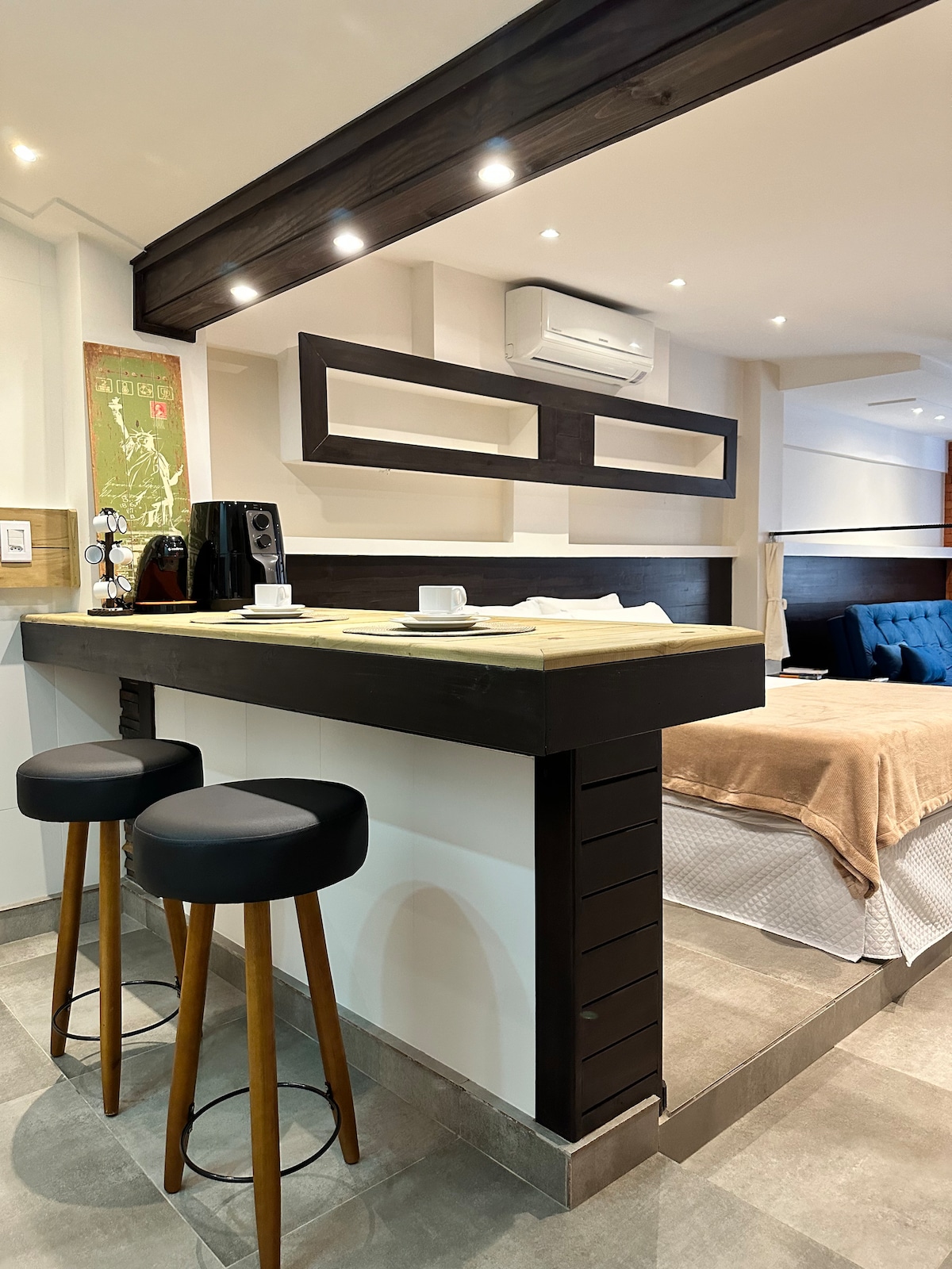 Studio com cozinha compacta, fogão elétrico 02 bocas, frigobar, forno microondas e todos utensílios para o preparo de refeições rápidas. Cama queen com a possibilidade de cama extra para uma criança, sob consulta com taxa extra. Banheiro privativo, ar condicionado, tv e uma varanda. Aceitamos pet, um por apartamento, sob consulta.