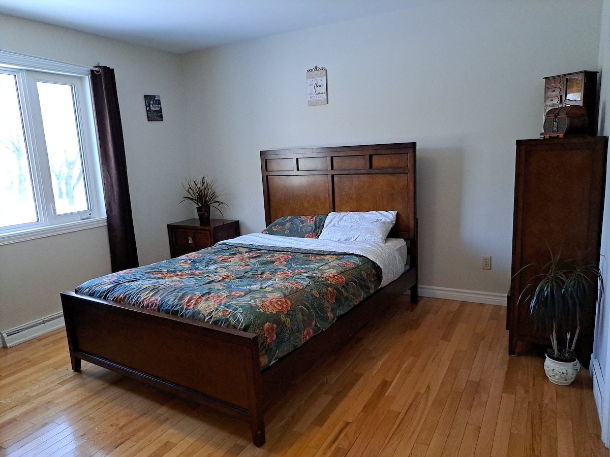 Logement privé Climatisé sans tapis, entrée privée et 3 stationnements gratuits. (Propriétaire habite au dessus) C'est sécuritaire et tranquille. Chacune des 3 chambres ont un lit KING. Wi-Fi, Téléviseur 43'' et évier dans chaque chambre. La proximité de tous les axes routiers facilitera vos déplacements. Un maximum 3 personnes par chambre. Anti-allergène; sans animaux, ni d'oiseaux ou reptiles. NON FUMEUR/ DROGUE. Emplacement extérieur avec BBQ et table (du mois de juin à octobre).