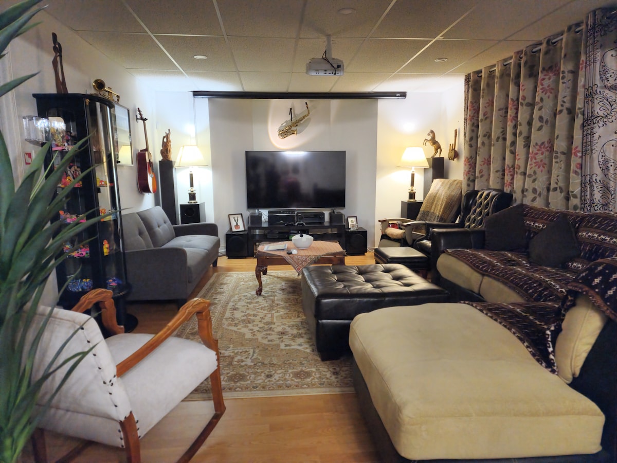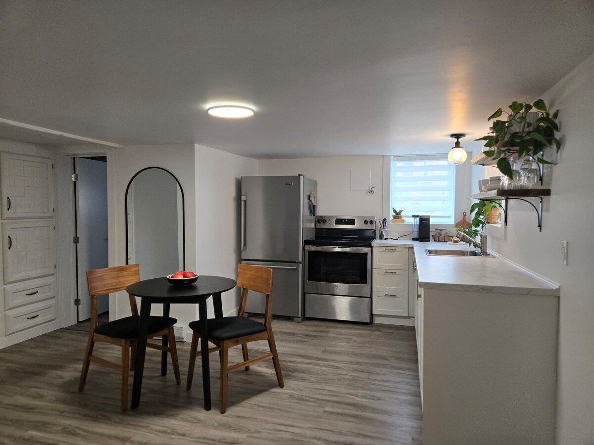 Jolie suite, chaleureuse et confortable. WIFI gratuit et illimité. Entrée indépendante avec couloir et espace pour les manteaux et les chaussures. Dans le salon, café et thé sont à votre disposition, ainsi qu'un petit frigo. Télévision de 49 pouces avec un Roku incluant Netflix, Disney et Prime. Espace d'entrainement privatif. Bureau pour le télé travail dans la chambre. Un lit queen size, avec literie fournie. Salle d'eau moderne avec plancher chauffant et serviettes fournies.